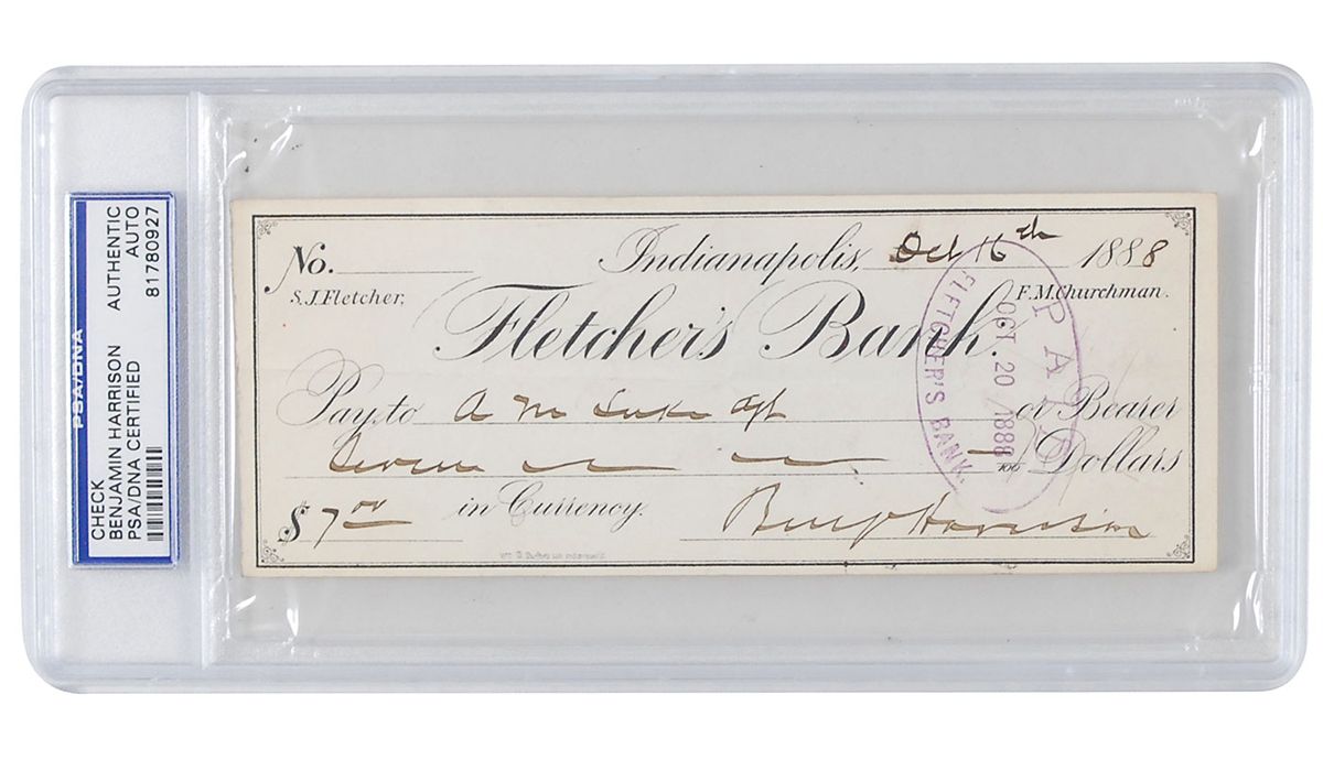 Bank check, 7 x 2.75, filled out and signed by Harrison, “Benj. Harrison,” made payable for $7.00, October 16, 1888. In fine condition, with central vertical and horizontal folds, and expected bank stamps and cancellation cuts (close to but not affecting the signature).