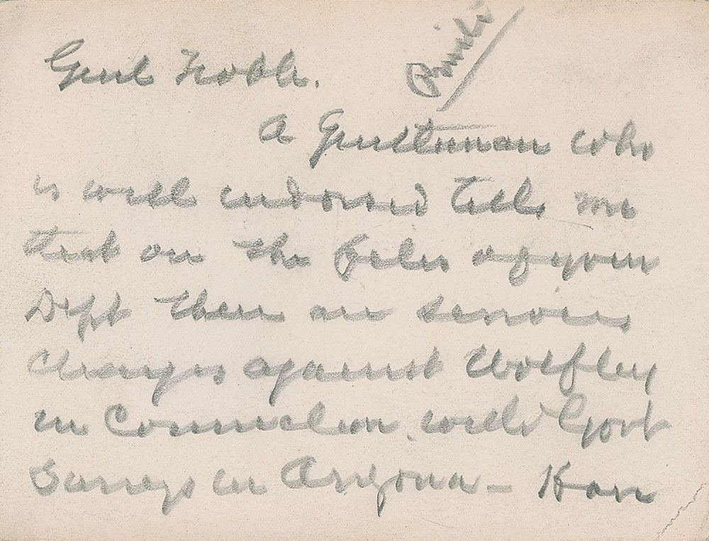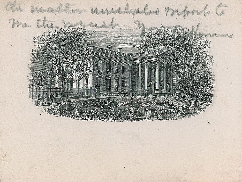 Scarce ALS as president, in pencil, signed “B. Harrison,” on both sides of a 4.75 x 3.5 card bearing an engraving of the White House, no date. Headed at the top, “Private,” Harrison writes to his Secretary of Interior John Noble. In full: “A gentleman who is well endorsed tells me that on the files of your Dept there are serious charges against [Arizona Territorial Governor Lewis] Wolfley in connection with Govt Surveys in Arizona—Have the matter investigated & report to me the result." In fine condition, with a small crease to lower right corner, not affecting text or engraving, and first initial of signature over top edge of image. Due in large part to his complete lack of political skill and experience, much of Wolfley’s time in office was mired in political scandal, which eventually led to his resignation.