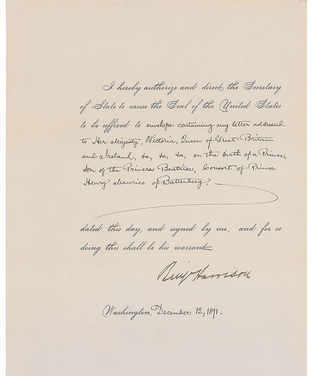 Partly-printed DS as president, signed “Benj Harrison,” one page, 8 x 10, December 12, 1891. Harrison orders the secretary of state to affix the seal of the United States to the “envelope containing my letter addressed to Her Majesty, Victoria, Queen of Great Britain and Ireland, etc., tc., tc., on the birth of a Prince, son of Princess Beatrice, Consort of Prince Henry Maurice of Battenberg.” In fine condition. The Prince mentioned is Prince Maurice of Battenberg, Beatrice’s last child. He was killed in battle at Ypres Salient during World War I in 1914. An exceptional formal document to one of Britain’s most well-known monarchs.