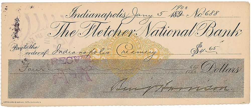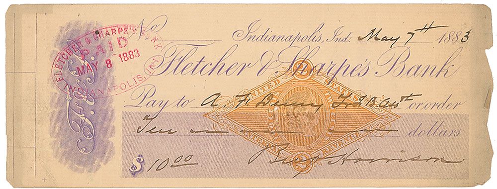 Three checks, dating from 1883 and 1900, all signed “Benj. Harrison,” including two filled out by Harrison. Scattered edge wear, cancellation cuts to bodies, with one slightly affecting middle portion of signature, otherwise fine condition.