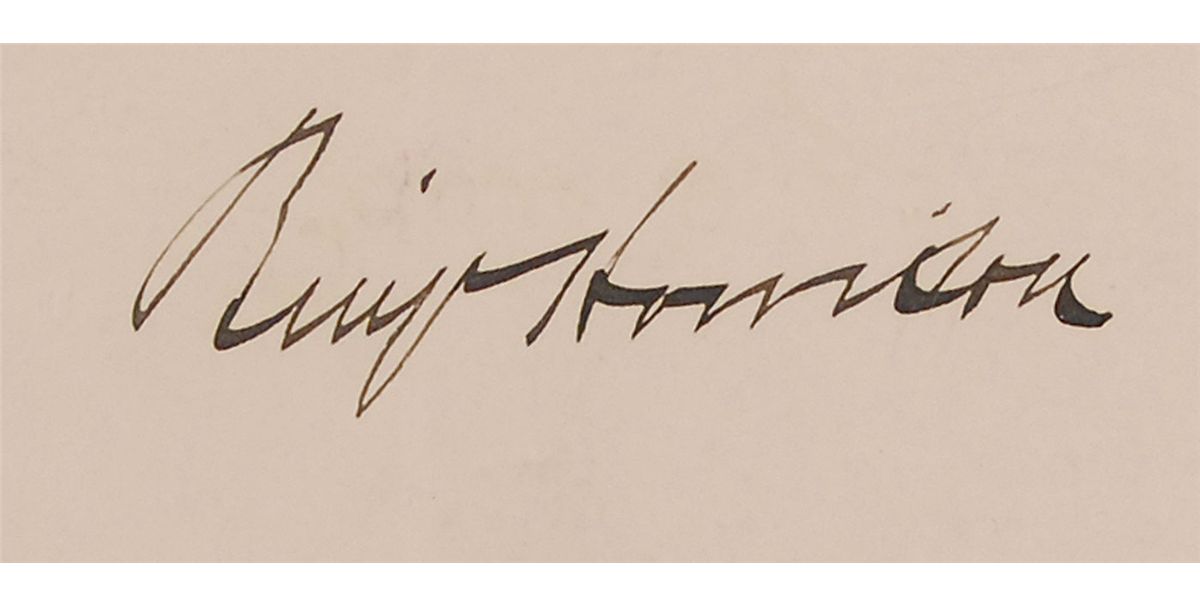 Partly-printed DS as president, signed “Benj. Harrison,” one page, 18.5 x 14.5, January 10, 1891. President Harrison appoints Carl E. Johnson as “Notary Public for the District of Columbia.” Boldly signed at the conclusion by Harrison and countersigned by Attorney General William H. H. Miller. The red Department of Justice seal affixed to the lower left remains crisp and fully intact. Intersecting folds, light area of toning from the seal, and a tape-repaired chip to the lower left corner, otherwise fine condition.