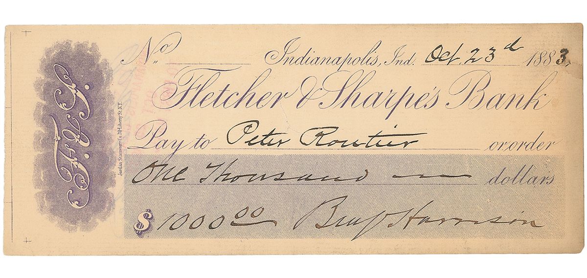 Bank check, 7.25 x 3, filled out and signed by Harrison, “Benj. Harrison,” payable to Peter Routier for $1000.00, October 23, 1883. In fine condition, with cancellation cut to center and some light toning to edges.