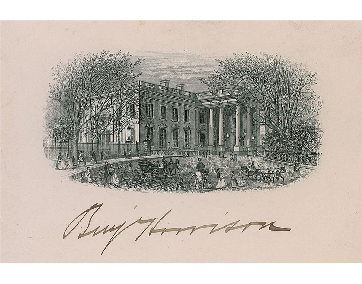 Engraved portrait of the exterior of the White House, 4.75 x 3, signed under the image in black ink, “Benj. Harrison.” In fine condition.