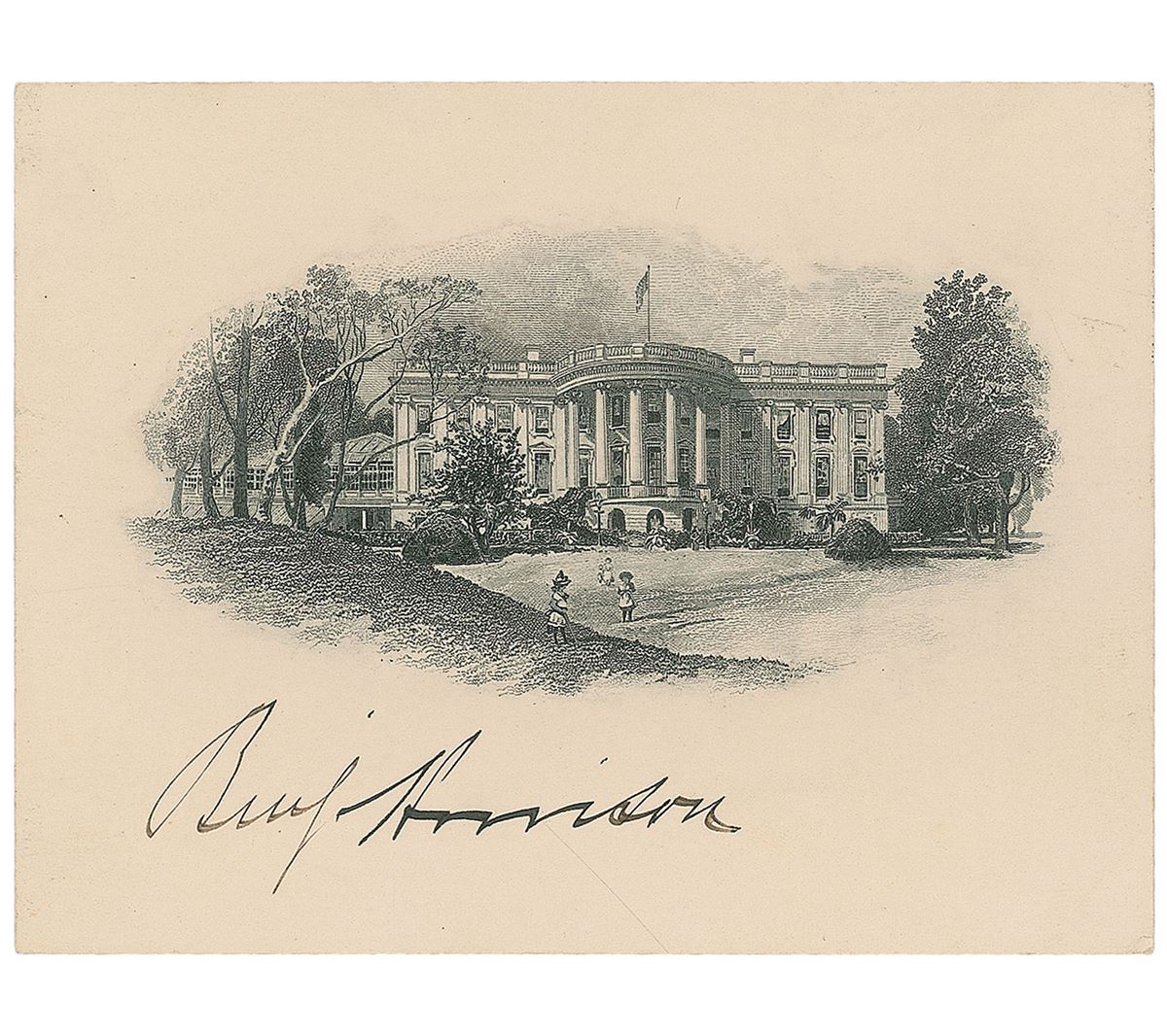 Engraved portrait of the exterior of the White House, 4.75 x 3.75, signed along the bottom, “Benj. Harrison.” In fine condition, with the first name a shade light.