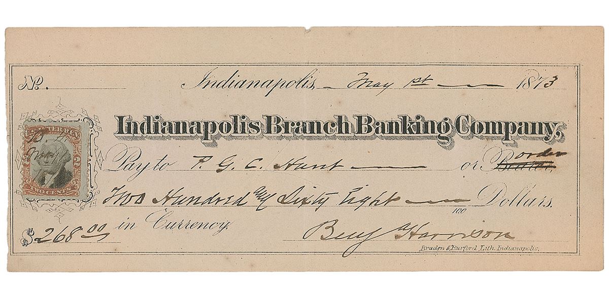 Indianapolis Branch Banking Company check, 7.75 x 3.25, filled out and signed by Harrison, “Benj. Harrison,” payable to P. G. C. Hunt for $268, May 1, 1873. A two-cent revenue stamp affixed to the left side is also initialed “B. H.” Three vertical folds, expected cancellation cuts to the body, and light scattered foxing, otherwise fine condition.