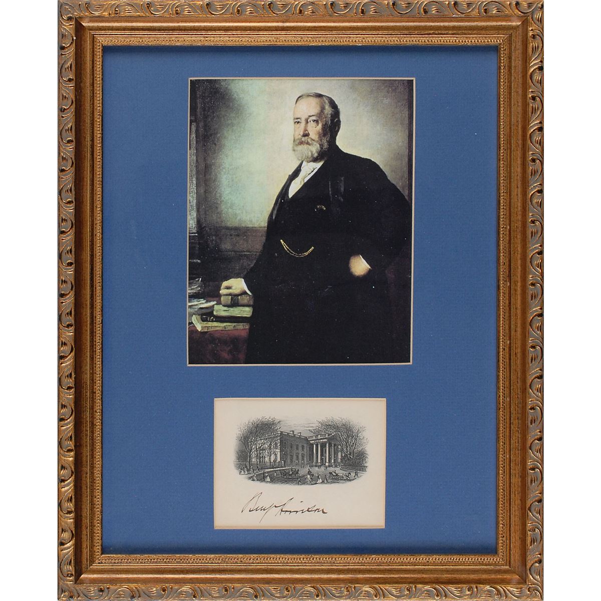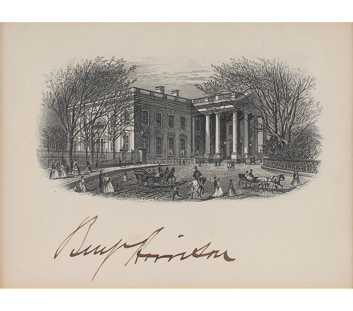 Engraved portrait of the exterior of the White House, 4.5 x 3.25, signed under the image in black ink. Matted and framed with a portrait of Harrison in a three-quarter length pose to an overall size of 13 x 16. In fine condition.