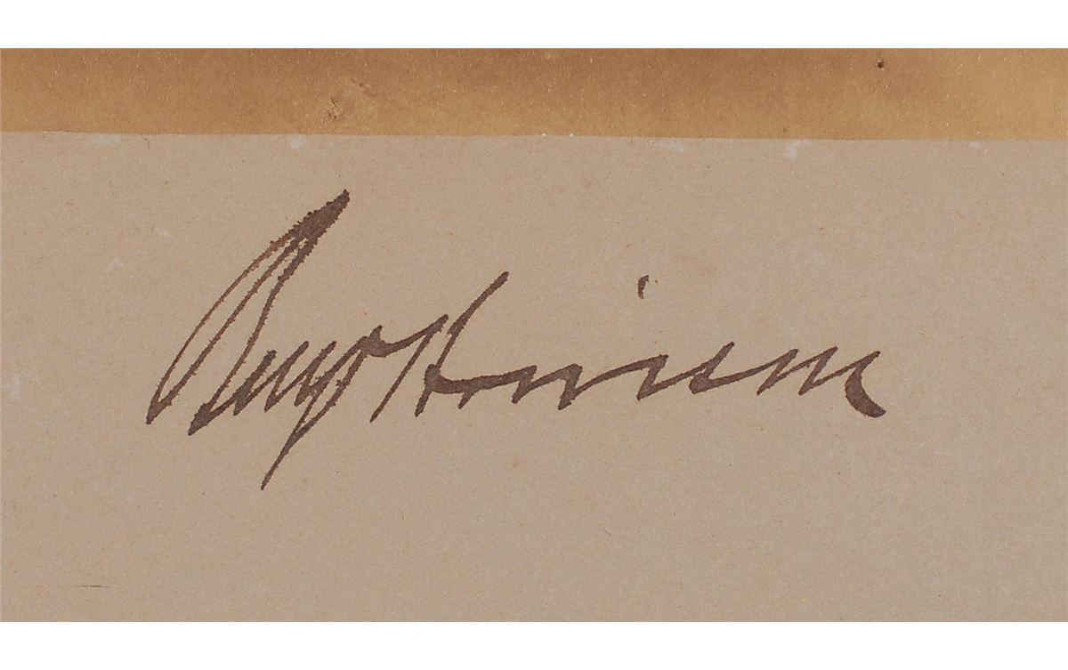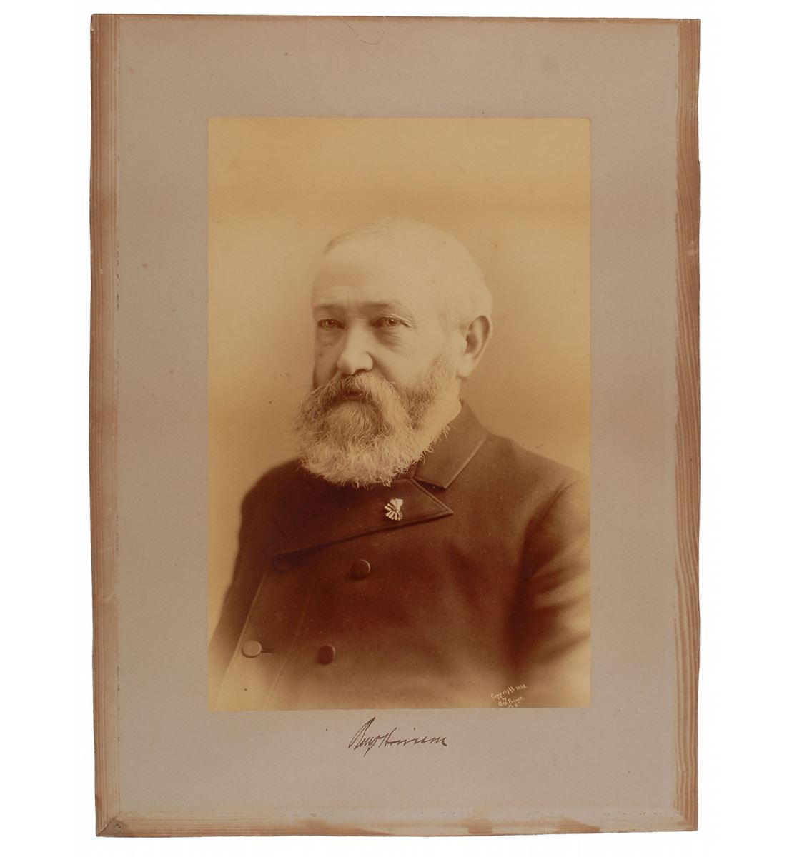 Imposing 10 x 15.5 portrait of Harrison taken in 1888 by George Prince, affixed to a 26 x 21.5 mount, signed on the mount in black ink, “Benj. Harrison.” Toning to edges from previous display and a large repaired chip to the top edge of the mount, otherwise fine condition. Three weeks after Harrison was elected president in November 1888, the Washington Post reported that local photographer George Prince, whose studio was on the corner of Pennsylvania Avenue and 11th Street, had gone to Indianapolis and ‘made a large photograph of General Harrison.’