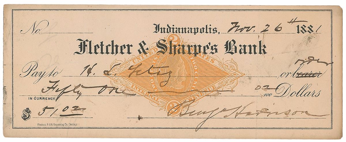 Fletcher & Sharpe’s Bank check, 7.75 x 3, filled out in another hand and signed by Harrison, payable to H. L. Tetaz for $51.02, November 26, 1881. Three vertical folds (one passing through a single letter of the signature), scattered soiling and stray ink marks, and expected cancellation cuts to the body, otherwise fine condition.