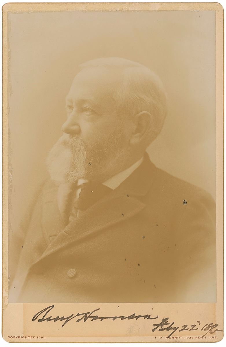 Original glossy 4.25 x 6.25 cabinet photo by Merritt Studios of Washington, D. C., signed on the mount in black ink, “Benj. Harrison, Feby 22, 1895.” Mild block of toning over signature, a few dings and surface marks to image, and mounting remnants along two edges, otherwise fine condition.
