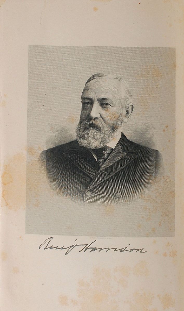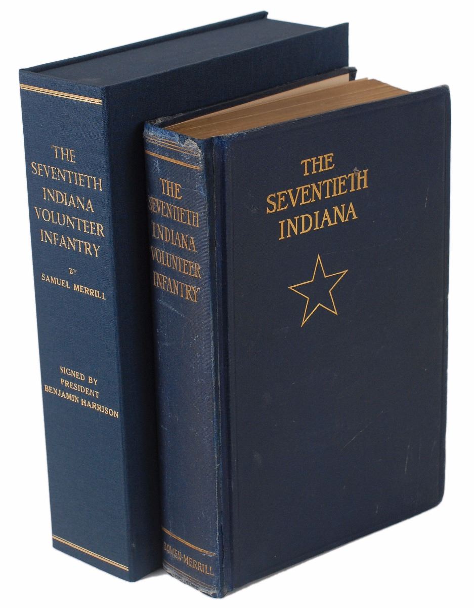 Signed book: The Seventh Indiana. Extremely rare, little-known signed edition. Indianapolis: The Bowen-Merrill Company, 1900. Hardcover, 6.25 x 9.25, 372 pages. Signed on the frontispiece in ink, “Benj. Harrison.” Autographic condition: very good, with scattered foxing and soiling to frontispiece; signature remains bold and unaffected. Accompanied by an unsigned first edition, first printing for comparison. Book condition: VG-/None, in a VG+ custom-made case. Unsigned volume in VG-/None condition. The first edition, first printing bears a printed facsimile signature on the frontispiece, while this special edition was left blank and authentically signed by Harrison; he only signed about a hundred of these volumes in the year before he died. The special signed edition is also differentiated by the gilt upper textblock edge.