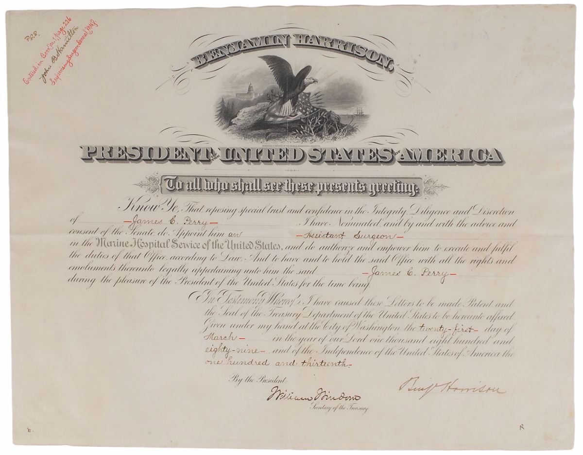 Partly-printed vellum DS as president, signed “Benj. Harrison,” one page, 17.5 x 13.75, March 21, 1889. President Harrison appoints James C. Perry as “an Assistant Surgeon in the Marine Hospital Service of the United States.” Signed at the conclusion by Harrison and countersigned by Secretary of the Treasury William Windom. In fine condition, with expected document wear, scattered creases, and light soiling.
