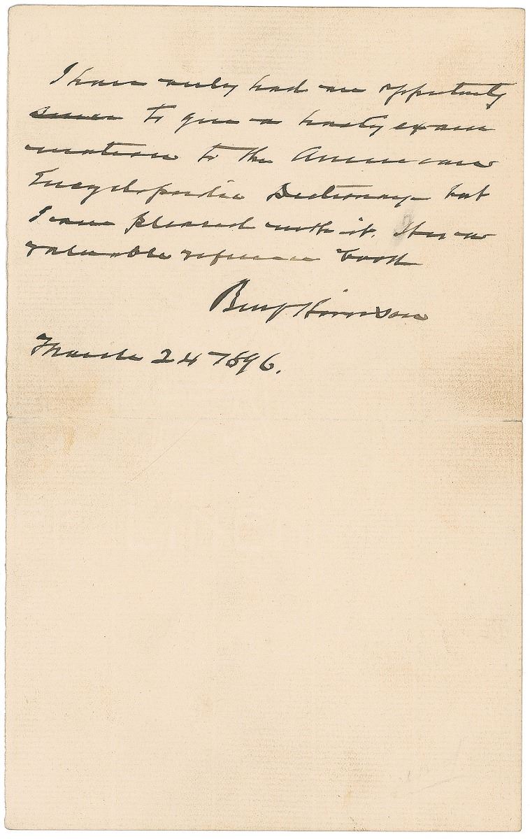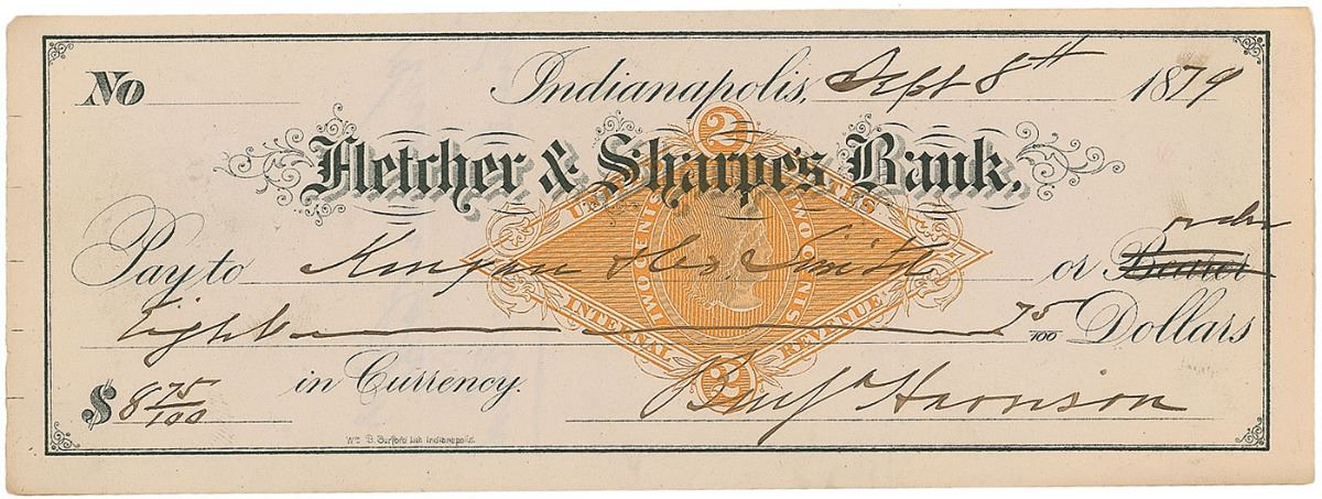Two items: a Fletcher & Sharpes Bank check, 7.75 x 2.75, filled out and signed by Harrison, “Benj. Harrison,” payable to Kangan Smith for $8.75, September 8, 1879; and an ANS signed “Benj. Harrison,” one page, 4.75 x 7.75, March 24, 1896, in which Harrison accepts an American Encyclopedic Dictionary as a gift. In overall fine condition, with two vertical folds (one passing through a single letter of the signature), staples holes, and repaired central cancellation cuts to the check, and slight soiling and a smudge to a single letter of the writing to the ANS.