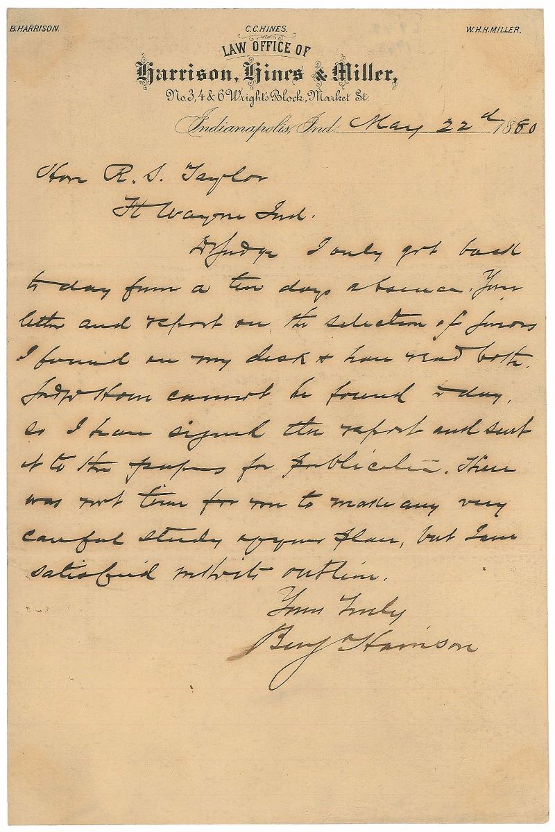 ALS signed “Benj. Harrison,” one page, 5.5 x 8.25, Law Office of Harrison, Hines & Miller letterhead, May 22, 1880. Letter to Judge R. S. Taylor. In part: “Your letter and report on the situation of Jurors I found on my desk & have read both…I have signed the report and sent it to the papers for publication. There was not time for me to make a very careful study…but I’m satisfied with its outline.” In fine condition, with a light overall shade of toning, with slightly heavier spots to corners.