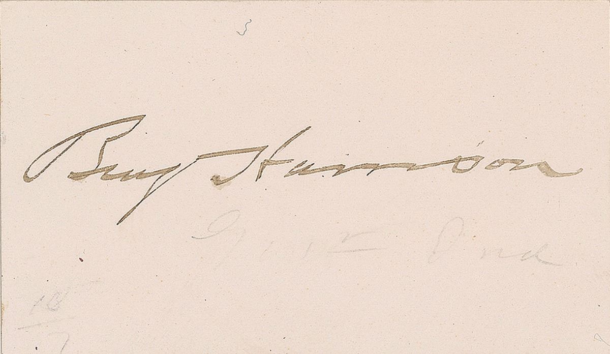 Ink signature, “Benj. Harrison,” on an off-white 3.25 x 1.75 card affixed to a same-size card. In fine condition, with erased pencil notations.