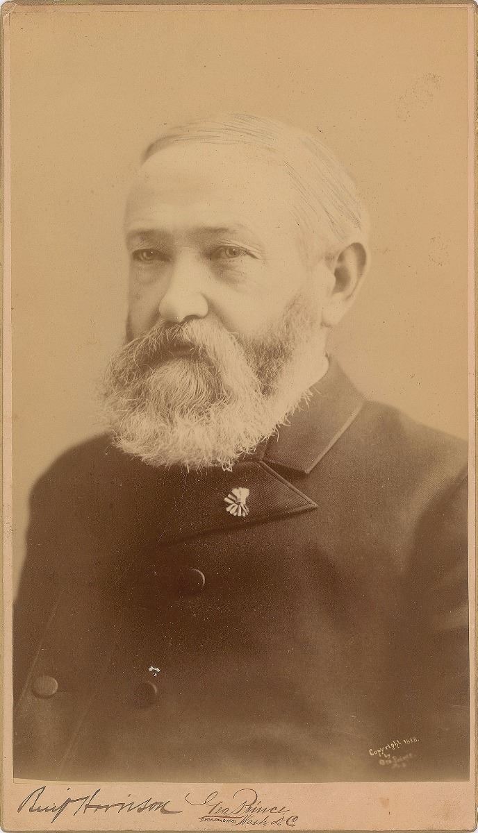 Scarce oversized 7.5 x 13 mounted albumen photo of Harrison taken by George Prince in 1888, boldly signed on the mount in ink, “Benj. Harrison.” In fine condition, with some subtle embellishments to Harrison’s hair. Three weeks after Harrison was elected president in November 1888, the Washington Post reported that local photographer George Prince, whose studio was on the corner of Pennsylvania Avenue and 11th Street, had gone to Indianapolis and ‘made a large photograph of General Harrison.’