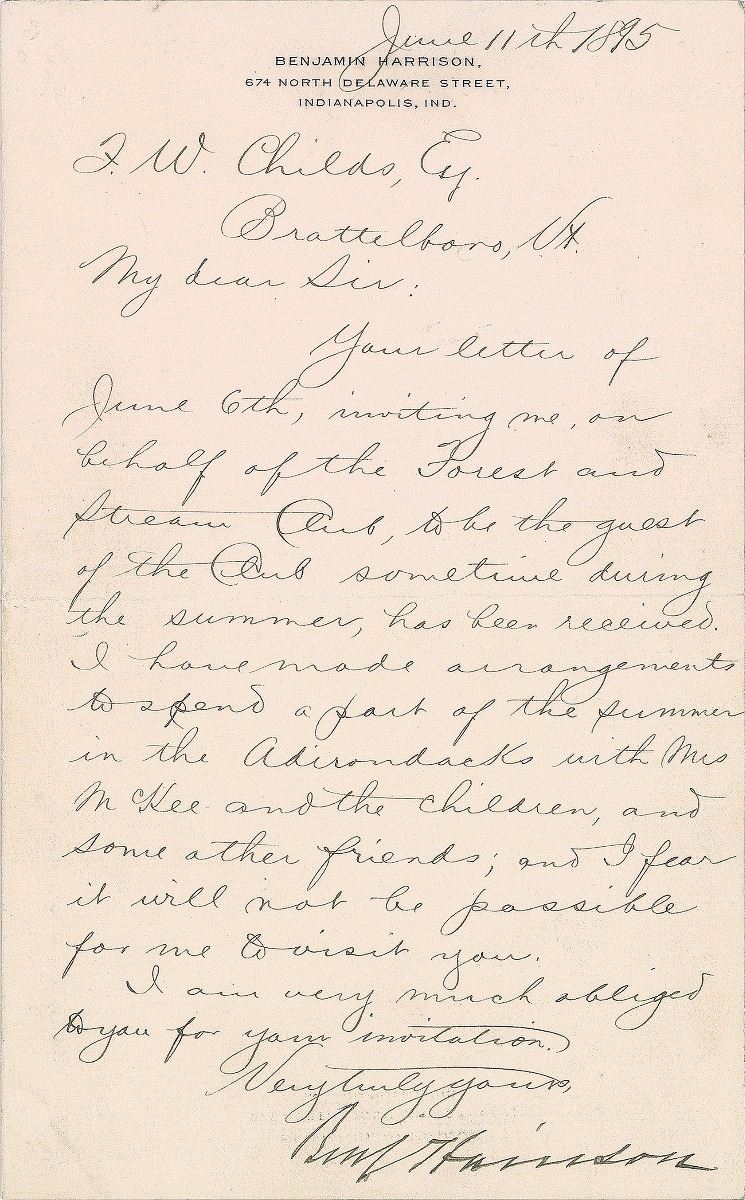LS signed “Benj. Harrison,” one page, 5 x 8, personal letterhead, June 11, 1895. Response to an invitation from “the Forest and Stream Club.” In part: “I have made arrangements to spend a part of the summer in the Adirondacks with Mrs. McKee and the children…I fear it will not be possible for me to visit you.” In fine condition.