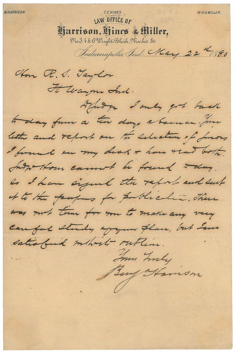 ALS signed “Benj. Harrison,” one page, 5.5 x 8.25, Law Office of Harrison, Hines & Miller letterhead, May 22, 1880. Letter to Judge R. S. Taylor. In part: “Your letter and report on the situation of Jurors I found on my desk & have read both…I have signed the report and sent it to the papers for publication. There was not time for me to make a very careful study…but I’m satisfied with its outline.” In fine condition, with a light overall shade of toning, with slightly heavier spots to corners.