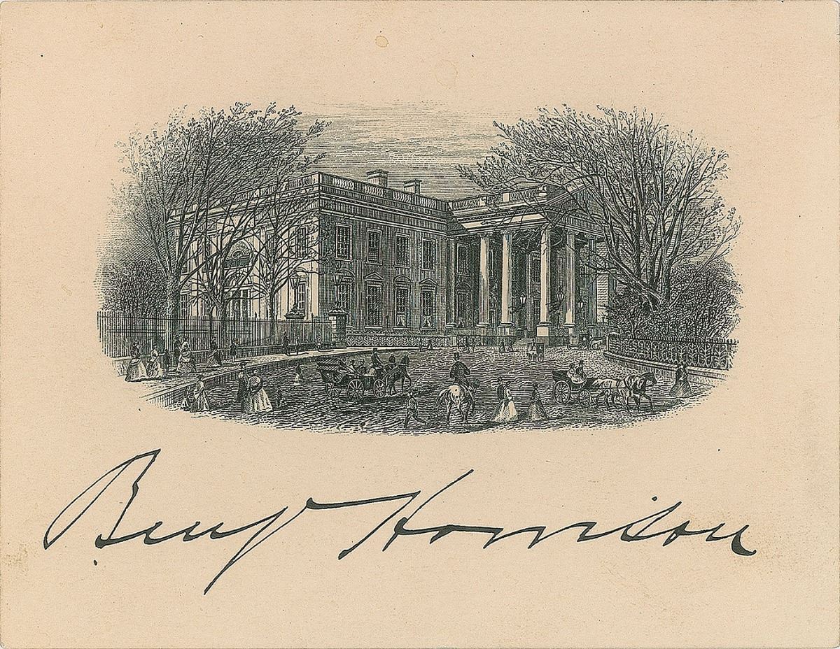 Engraved portrait of the exterior of the White House, 4.75 x 3.25, signed under the image in black ink, “Benj. Harrison.” In fine condition.