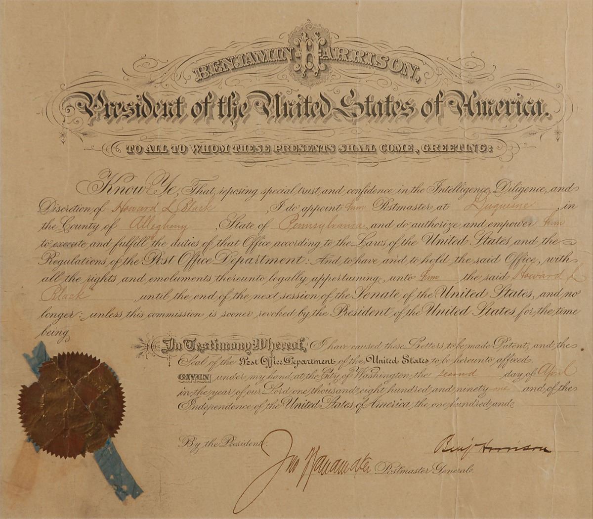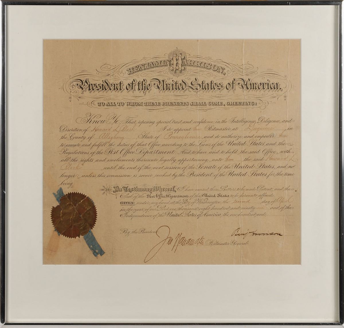 Partly-printed DS as president, one page, 16 x 14, April 2, 1891. President Harrison appoints Howard L. Black as “Postmaster at Duquesne, in the County of Allegheny, State of Pennsylvania.” Boldly signed at the conclusion by President Harrison and countersigned by Postmaster General John Wanamaker. The gold foil seal and blue ribbons remain partially intact. Matted and framed. Permanently affixed to a larger board and in very good condition, with noticeable moderate overall wrinkling and scattered creases and soiling.