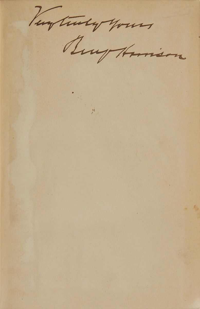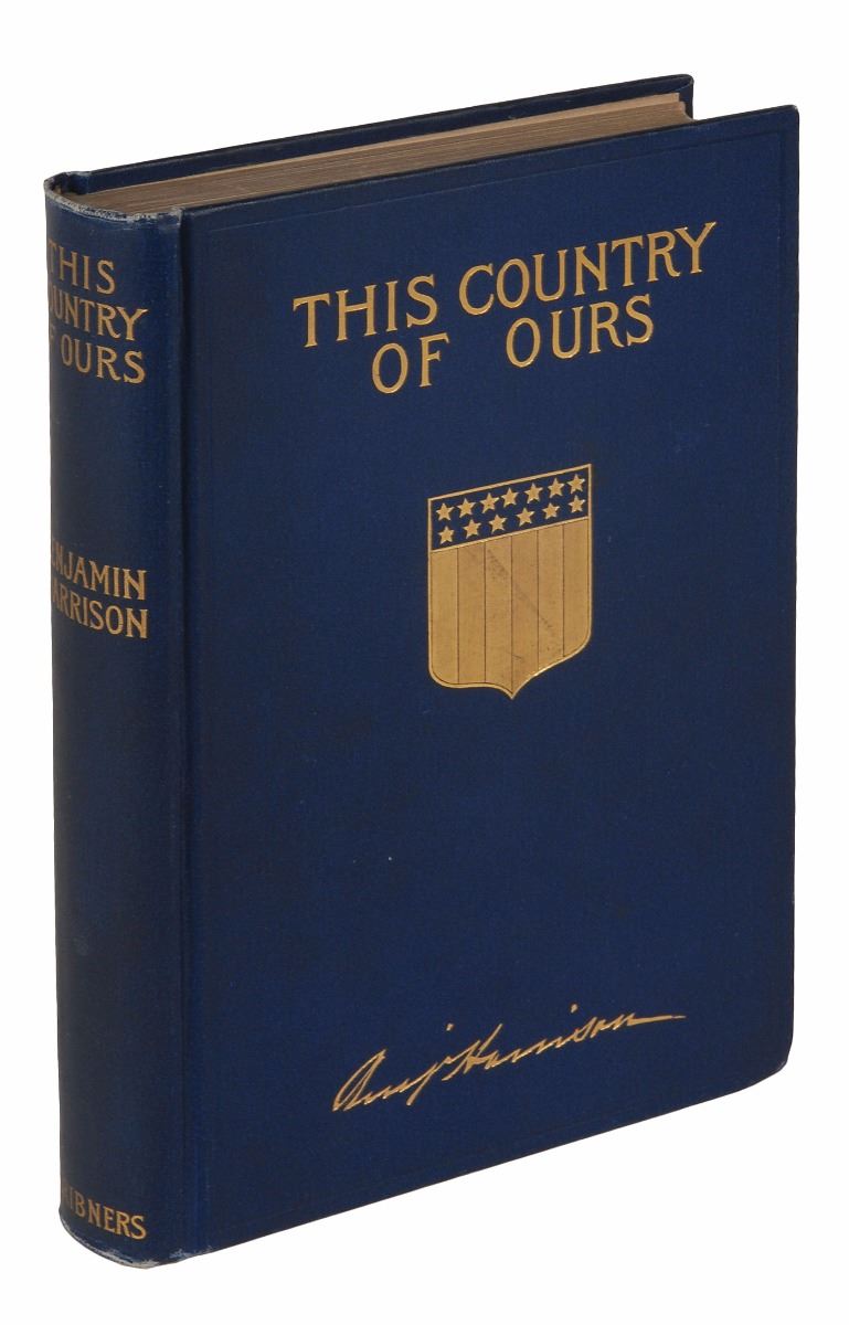 Signed book: This Country of Ours. First edition. NY: Charles Scribner's Sons, 1897. Hardcover, 5.25 x 7.5, 360 pages. Signed on the first free end page in black ink, “Very truly yours, Benj. Harrison.” The first free end page bears an ownership inscription in another hand, “Garstang, 3327 Washington Blvd.” Autographic condition: very good to fine, with light staining along the left edge of the signed page. Book condition: VG+/None, with trivial bumps to corners and wear at spine ends. The address penned inside is that of Dr. Reginald W. Garstang, who had served as assistant surgeon in the 157th Indiana Volunteer Infantry during the Spanish-American War. In the preface, Harrison describes this volume as “a modest attempt to give my readers a view of the machinery of our National Government in motion, and some instruction as to the relations and uses of its several parts.”