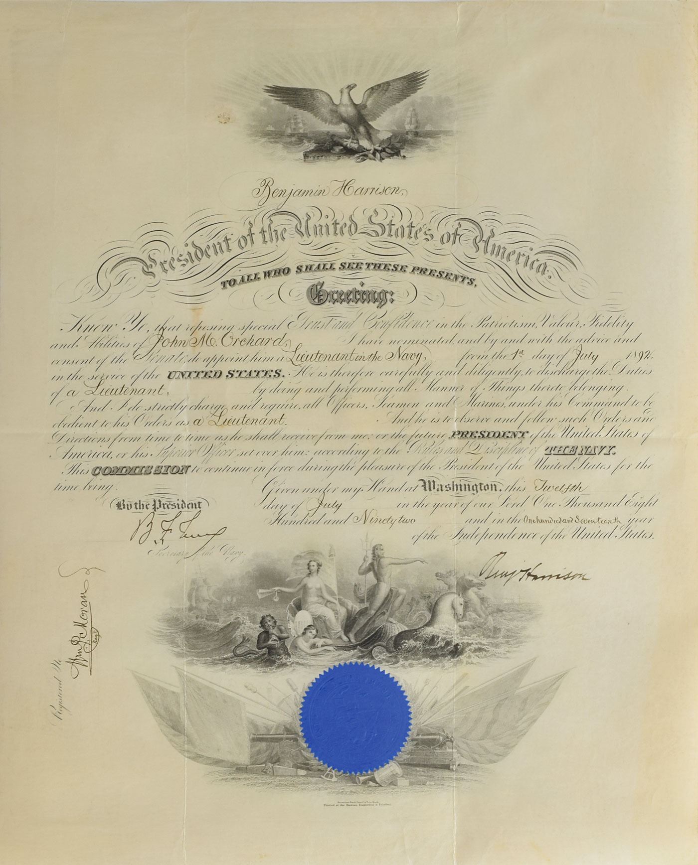 Crisp partly-printed vellum DS as president, signed “Benj. Harrison,” one page, 15.75 x 19.25, July 12, 1892. President Harrison appoints John M. Orchard as a "Lieutenant in the Navy." Signed at the conclusion by Harrison, and countersigned by Secretary of the Navy Benjamin F. Tracy. Blue Navy Department seal remains affixed to lower vignette. In fine condition.