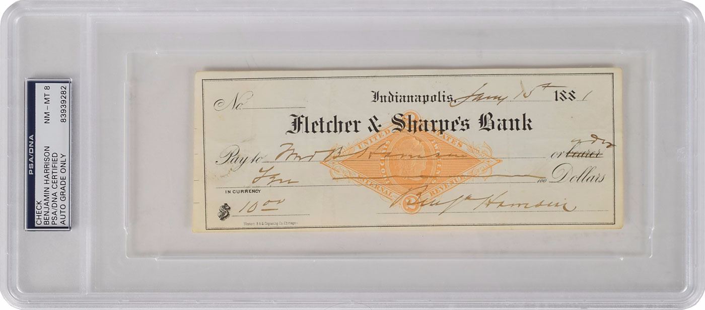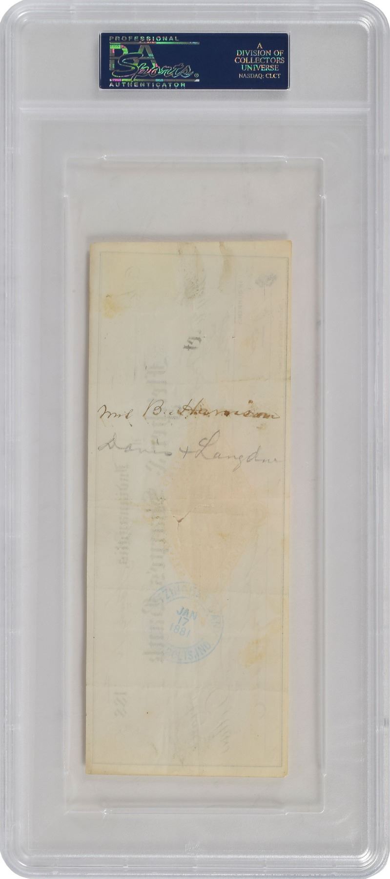 Bank check, 7.5 x 2.75, filled out and signed by Harrison, "Benj. Harrison," payable to his wife, "Mrs. B. Harrison," for $10, January 15, 1881; endorsed on the reverse by the future first lady Caroline Harrison, "Mrs. B. Harrison." Encapsulated in a plastic PSA/DNA authentication and grading holder, evaluating the autograph as "NM-MT 8." In fine condition, with several vertical folds.