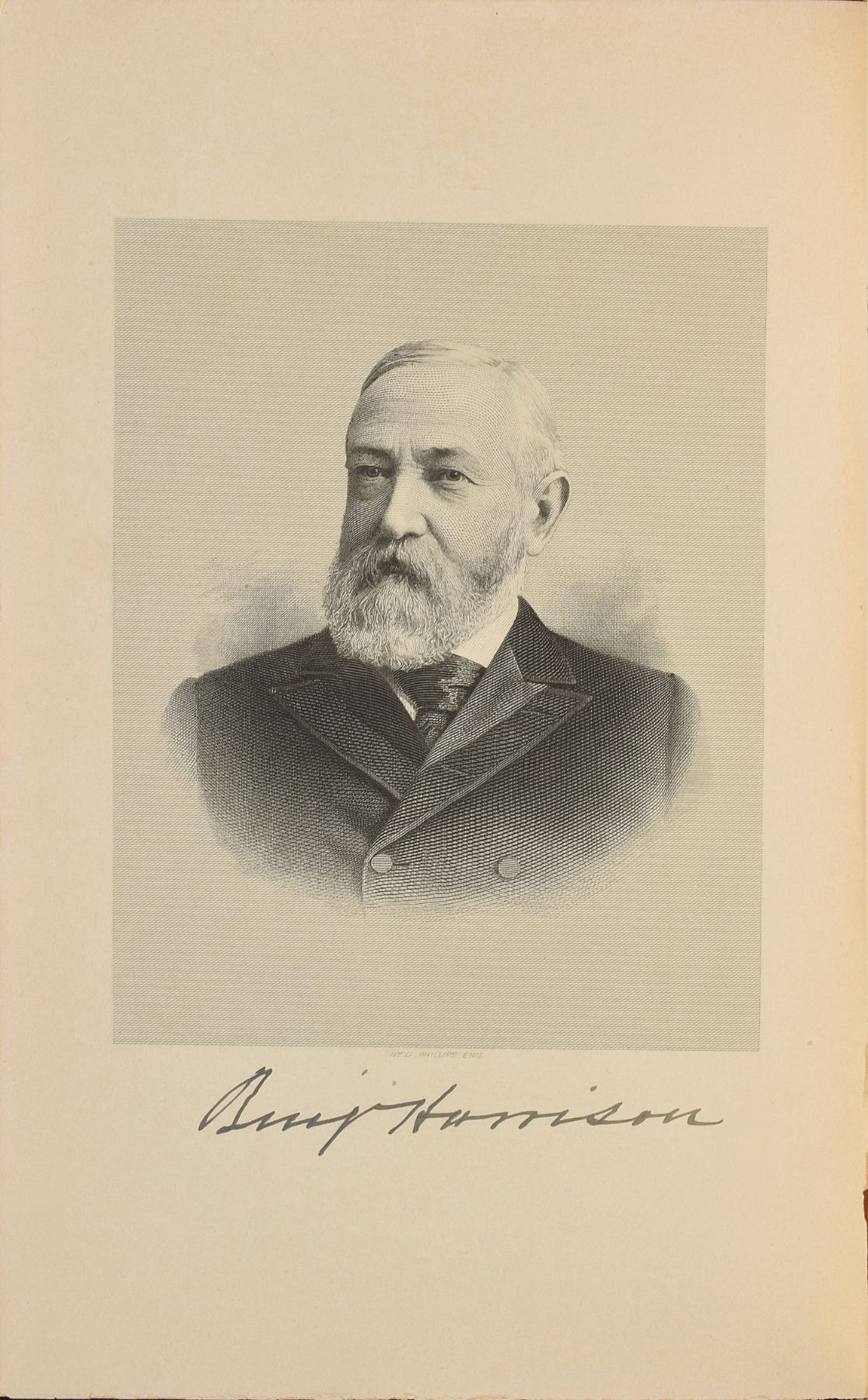 Signed book: The Seventieth Indiana. Extremely rare, little-known signed edition. Indianapolis: The Bowen-Merrill Company, 1900. Hardcover, 6.25 x 9.25, 372 pages. Signed on the frontispiece in ink, “Benj. Harrison.” Autographic condition: fine. Book condition: VG/None, with a split to the front pastedown at the hinge, and minor wear at spine ends. The first edition, first printing of The Seventieth Indiana bears a printed facsimile signature on the frontispiece, while this special edition was left blank and authentically signed by Harrison; he only signed about a hundred of these volumes in the year before he died. The special signed edition is also differentiated by the gilt upper textblock edge.