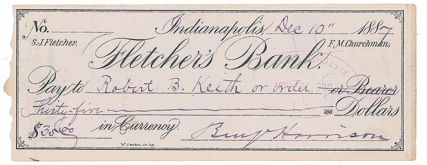 Fletcher's Bank check, 7.5 x 2.75, filled out in another hand and signed by Harrison, "Benj. Harrison," payable to Robert B. Keith for $35, December 10, 1887. In fine condition.