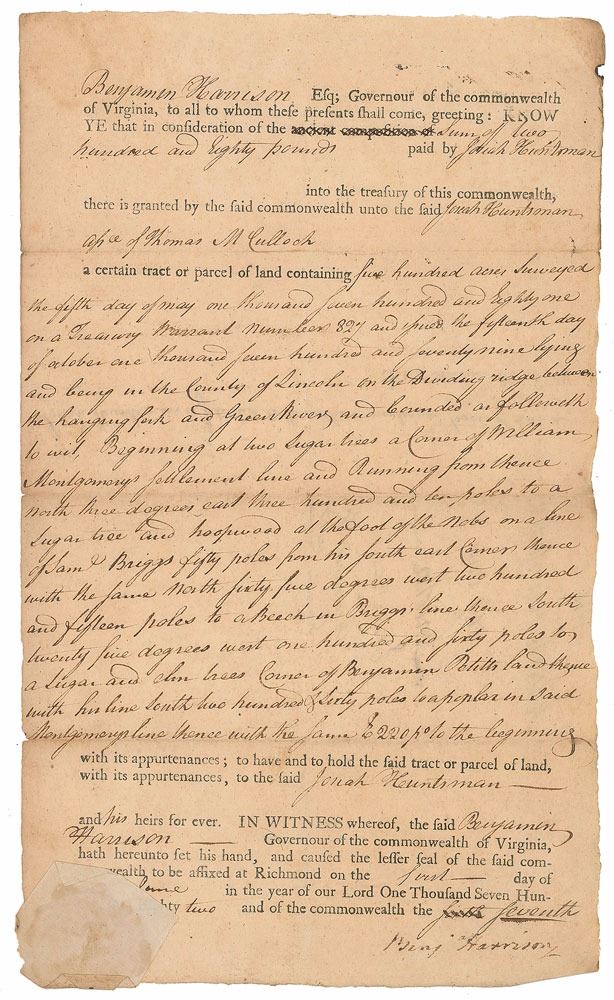 Signer of the Declaration of Independence from Virginia (1726–1791) who was the father of President William Henry Harrison and great-grandfather of President Benjamin Harrison. Partly-printed DS, signed “Benj. Harrison,” one page, 7.75 x 13.25, June 1, 1782. As governor of Virginia, Harrison grants Josiah Huntsman "a certain tract or parcel of land containing five hundred acres…being in the County of Lincoln on the Dividing ridge between the hanging fork and Green River." Signed at the conclusion by Harrison. The white paper seal affixed to the lower left remains mostly intact. In fine condition.