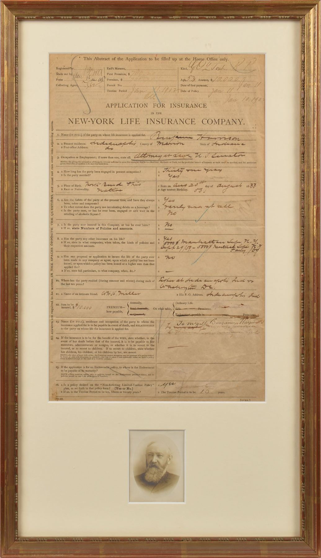Unusual partly-printed ADS, one page, 8 x 13, September 20, 1886. Application for life insurance with the New-York Life Insurance Company, filled out in Harrison's hand and signed twice (once on the front and once on the reverse, which is covered by the framing). Harrison fills out the questionnaire with personal information including his occupation ("Attorney at Law, U.S. Senator"), propensity to drink intoxicating beverages ("rarely ever at all"), and residency of the past ten years ("either at Indianapolis, Ind., or Washington D.C."). The upper portion of the document indicates that the $10,000 policy was paid out in January 1902, following Harrison's death in March 1901. Nicely matted and framed with a silver print of Harrison from the Frederick H. Meserve Collection to an overall size of 12 x 21. In very good condition, with overall toning and creasing, and a couple of small tears.