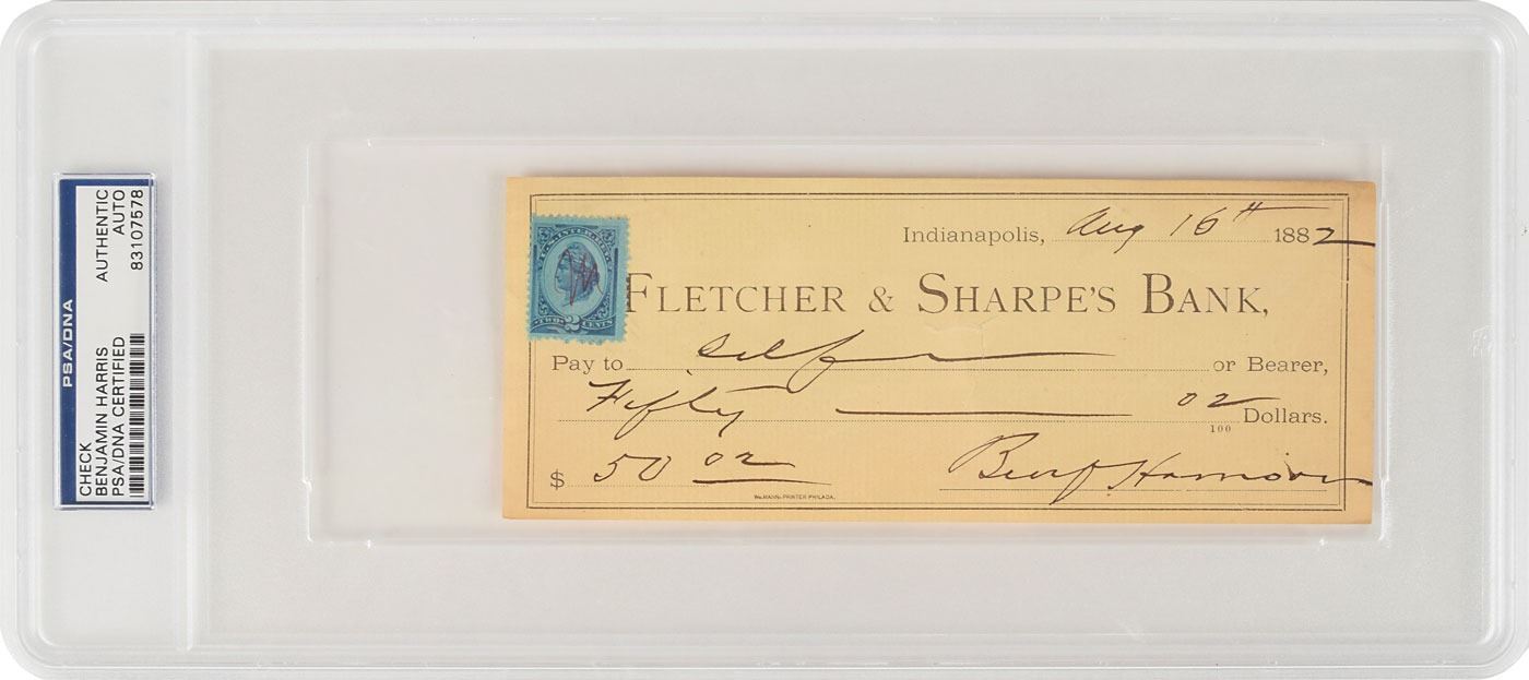 Fletcher & Sharpe's Bank check, 7 x 2.75, filled out and signed by Harrison, "Benj. Harrison," payable to "Self" for $50.02, August 16, 1882. In fine condition. Encapsulated in a plastic PSA/DNA authentication holder.