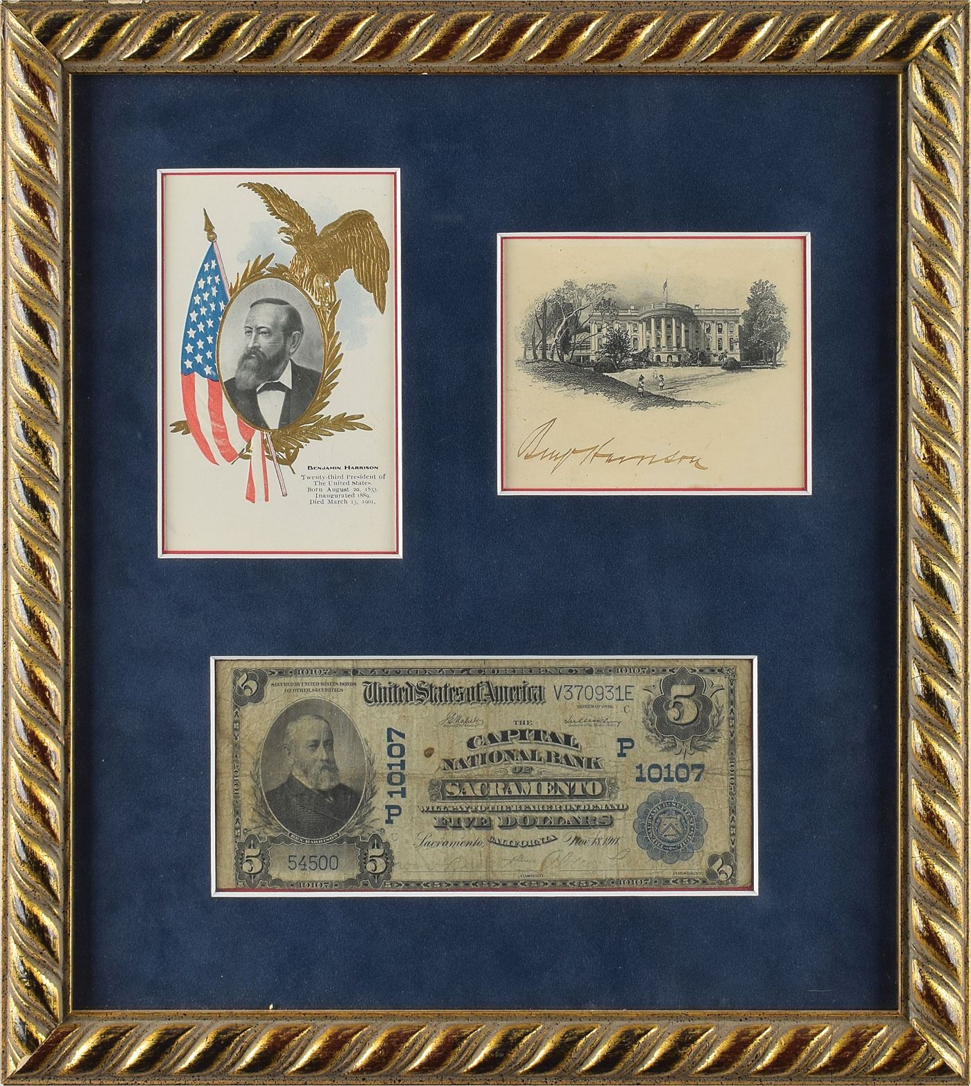 Handsome engraving featuring a front view of the White House, 4.25 x 3.25, signed below the vignette in ink, "Benj. Harrison." Archivally matted and framed with a desirable original five-dollar bill from 1911 issued at Sacramento (featuring a portrait of Harrison on the left side), and a commemorative postcard, to an overall size of 13.5 x 14.5. The signed engraving is in fine condition; the banknote is heavily creased and wrinkled.