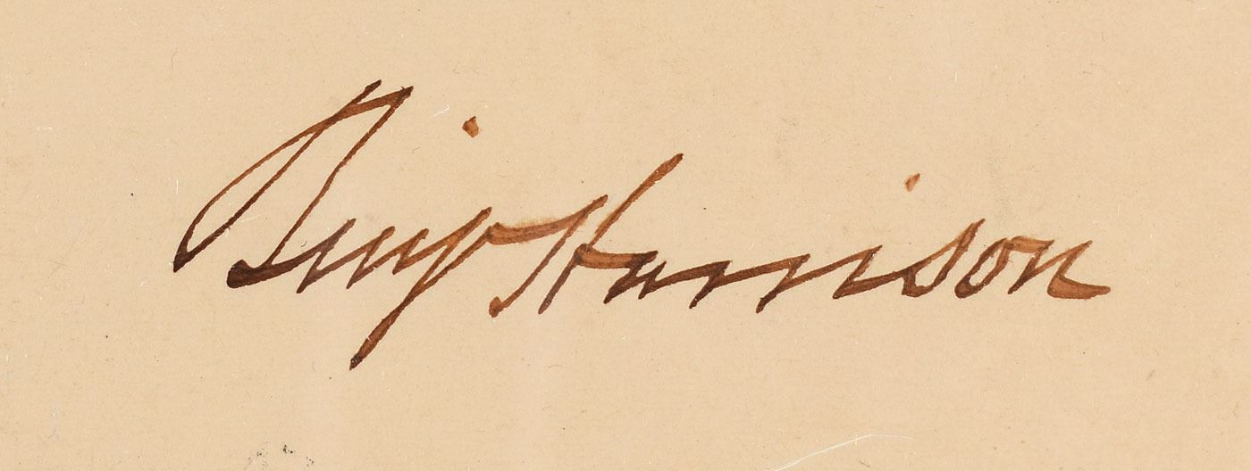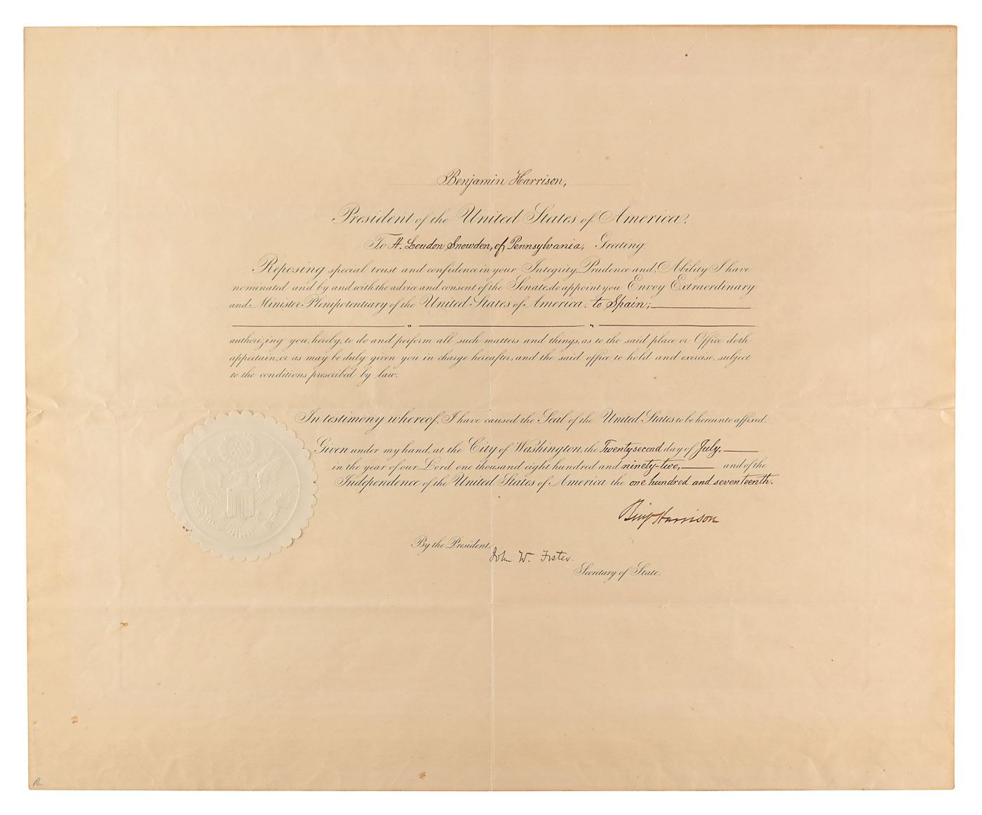 Partly-printed DS as president, signed “Benj. Harrison,” one page, 23 x 19, July 22, 1892. President Harrison appoints A. Loudon Snowden, of Pennsylvania, as "Envoy Extraordinary and Minister Plenipotentiary of the United States of America to Spain." Signed at the conclusion n fountain pen by Harrison and countersigned by Secretary of State John W. Foster. Beige paper seal remains affixed to lower left corner. In very good to fine, folded condition, with some light creasing and edge wrinkling.