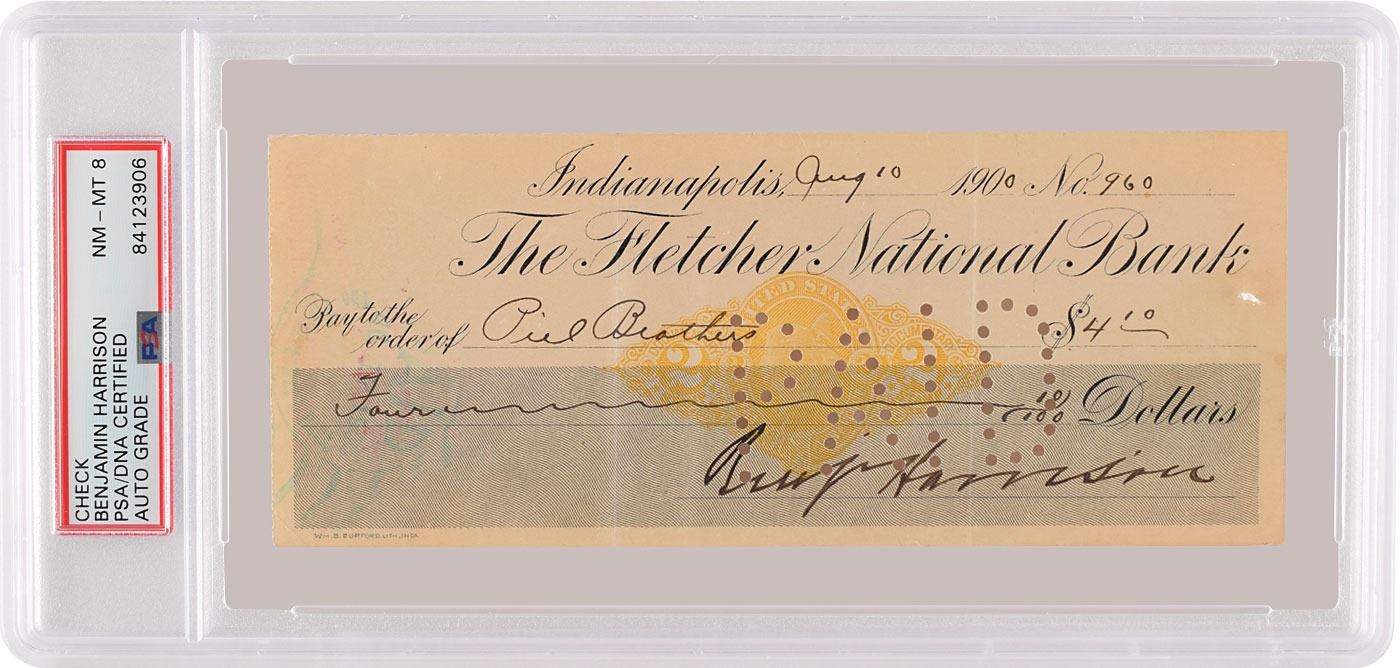 The Fletcher National Bank check, 7 x 2.75, filled out in another hand and signed by Harrison, "Benj. Harrison," payable to Piel Brothers for $4.10, August 10, 1900. In fine condition. Encapsulated in a PSA/DNA authentication and grading holder, evaluating the autograph as "NM–MT 8."