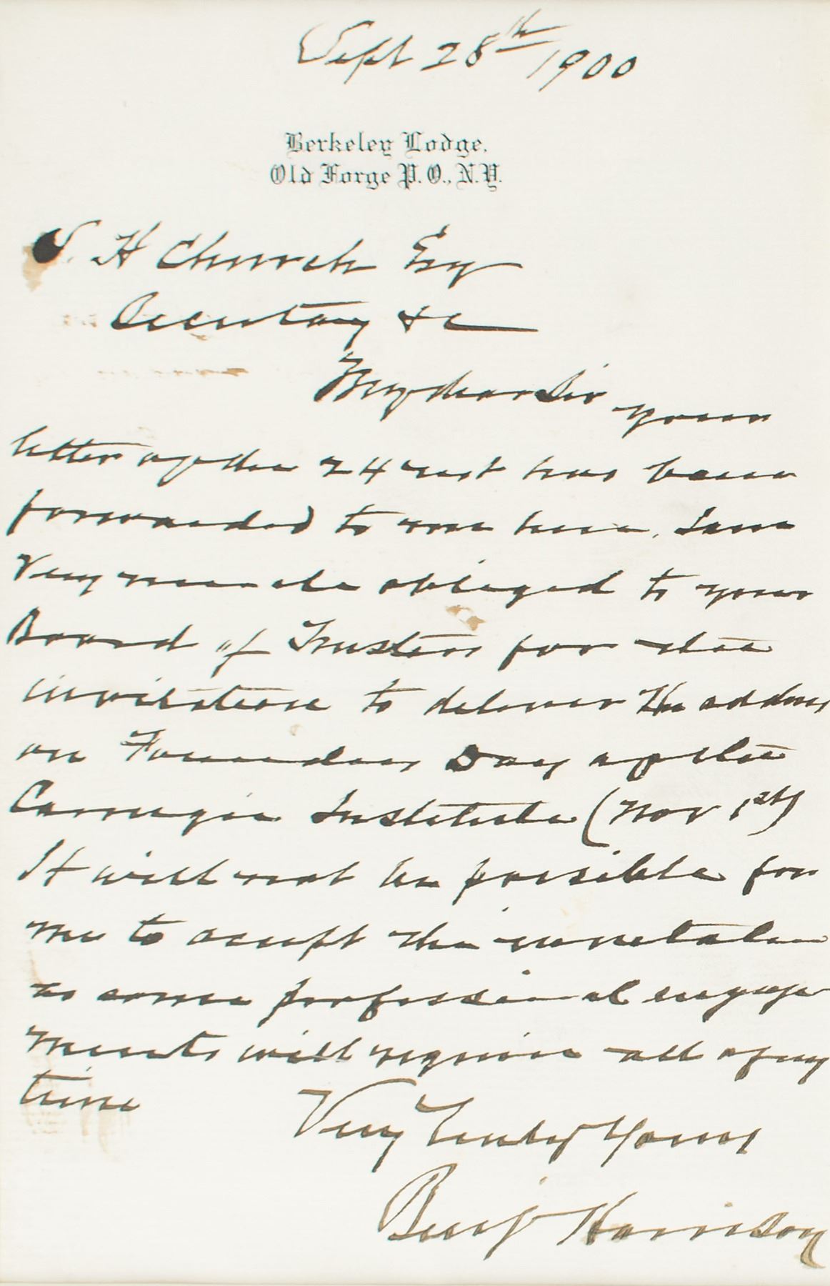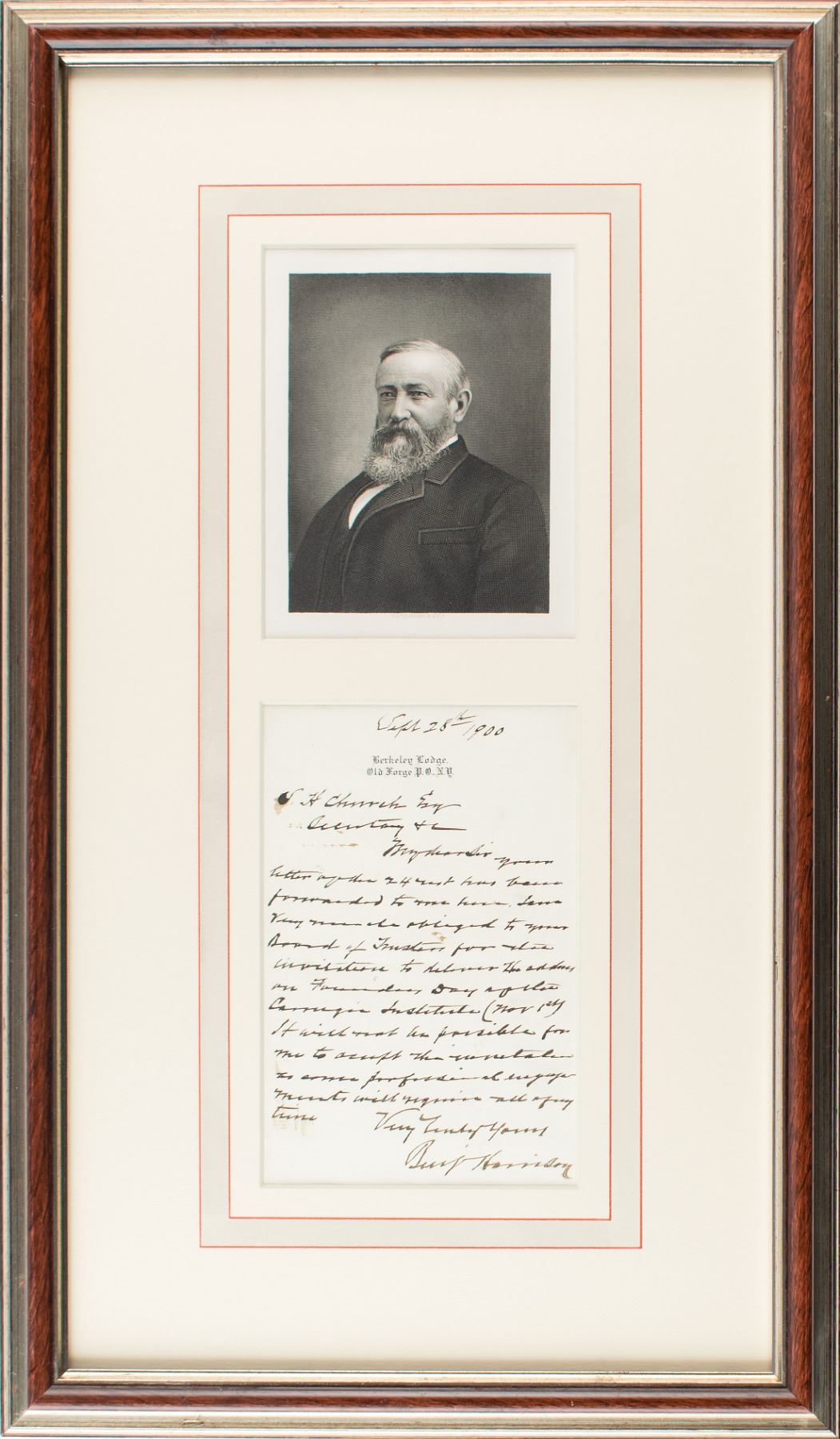 ALS signed “Benj. Harrison,” one page, 4.75 x 7.25, Berkeley Lodge letterhead, September 28, 1900. Letter to S. H. Church, in part: "I am very much obliged to your Board of Trustees for the invitation to deliver the address on Founders Day of the Carnegie Institute (Nov. 1st). It will not be possible for me to accept the invitation as some professional engagements will require all my time." Attractively matted and framed with an engraved portrait to an overall size of 12.75 x 21.75. In fine condition.