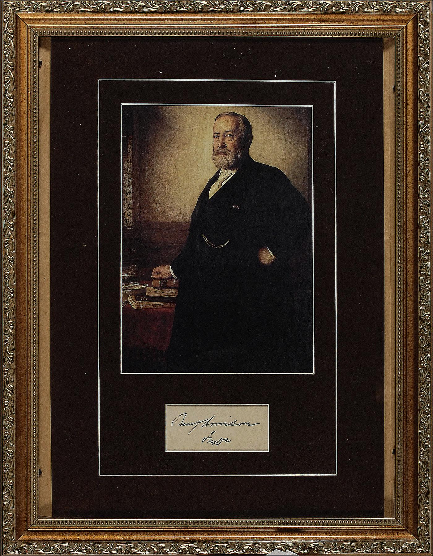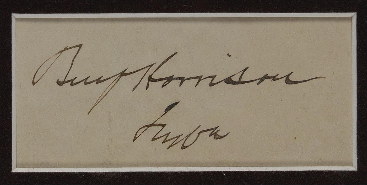 Ink signature, “Benj. Harrison, Inda,” on an off-white slip. Double suede matted and framed with a color portrait of Harrison, to an overall size of 14 x 18. In fine condition, with a bit of mild toning. Pre-certified John Reznikoff/PSA/DNA and RRAuction COA.
