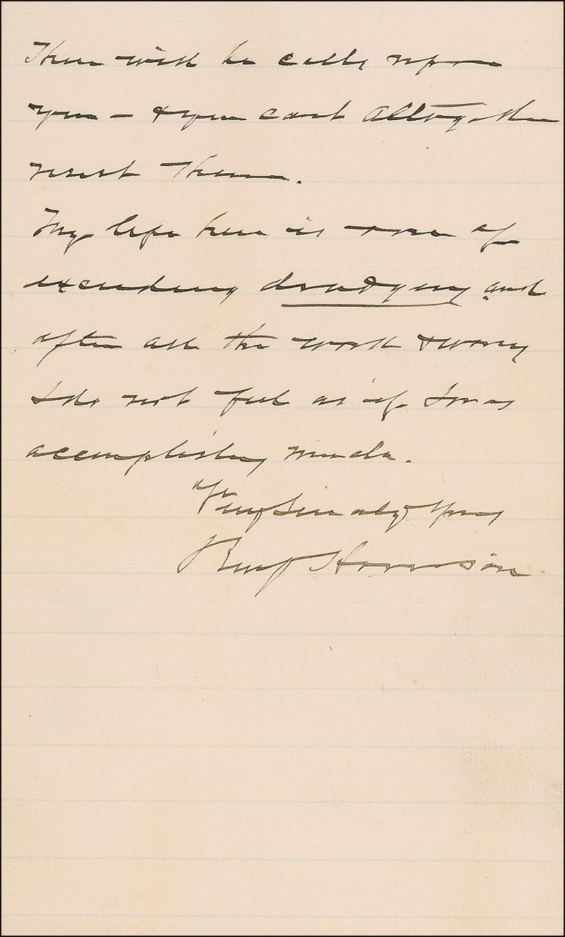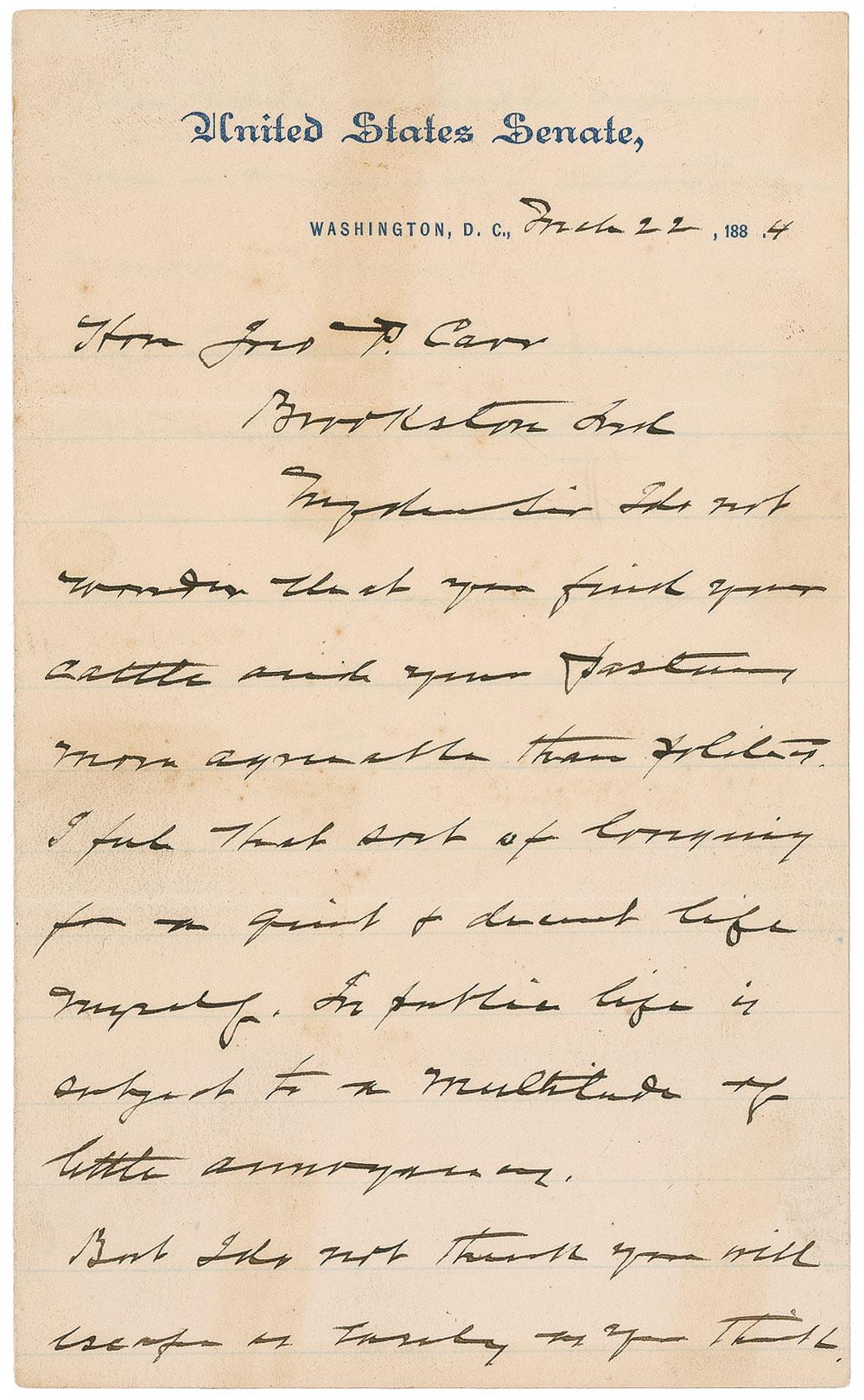 ALS signed “Benj. Harrison,” two pages, lightly-lined on two adjoining sheets, 5 x 8, United States Senate letterhead, March 22, 1884. Harrison writes former Union general and New York Secretary of State Joseph Carr. In part: “I find that sort of longing for a quiet and decent life myself. In public life in subject to a multitude of little annoyances…My life here is more of excruciating annoyances after all the work & worry I do not feel as if I’m accomplishing much.” In fine condition, with small separation along the spine, scattered toning, and mild soiling.