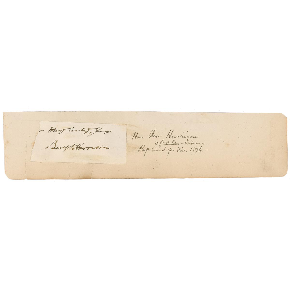 Fountain pen signature, “Very truly yours, Benja. Harrison,” on an off-white 3.25 x 1.5 slip clipped from the conclusion of an ALS and affixed to a larger sheet. In very good condition, with irregularly trimmed left edge and light staining from mounting residue. Upon his entrance to the US Senate in 1881, Harrison dropped the “a” from the first name of his signature, dating this example to before that time.
