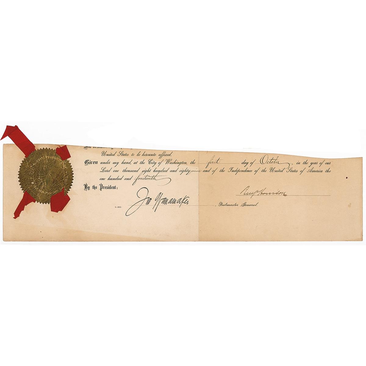 Partly-printed partial DS as president, signed “Benj. Harrison,” one page, 17 x 4.5, October 1, 1889. Lower portion of a postal appointment, signed by President Harrison and countersigned by Postmaster General John Wanamaker. In very good condition, with central vertical fold, uniform toning to right side, with scattered toning to left, and an irregular top edge. The gold foil seal is creased, but intact, and retains its red ribbon.