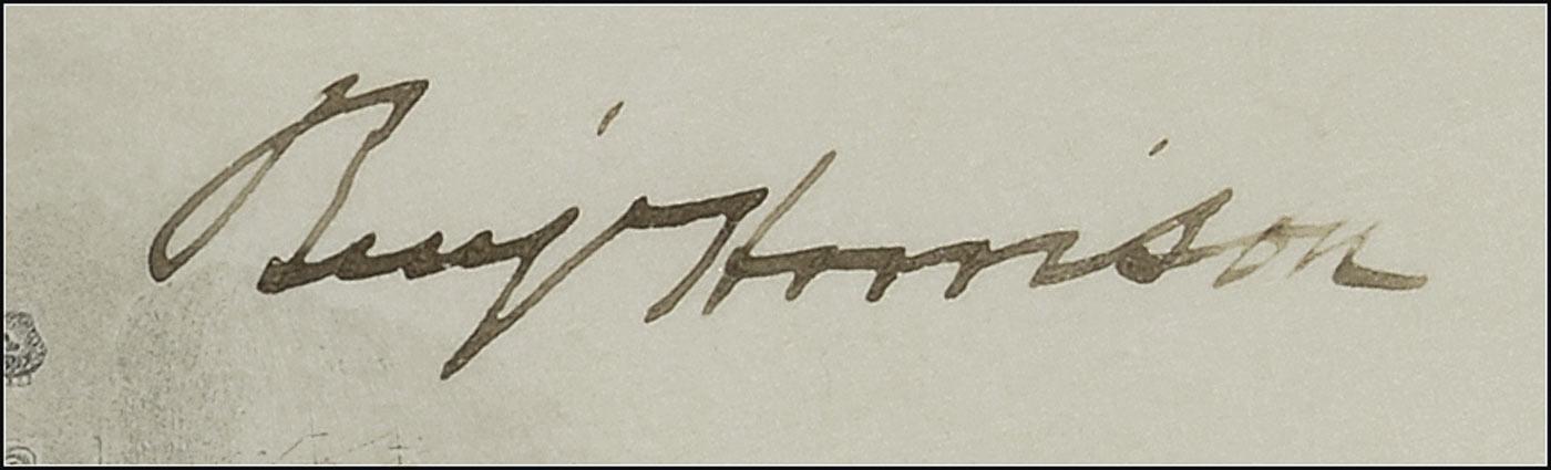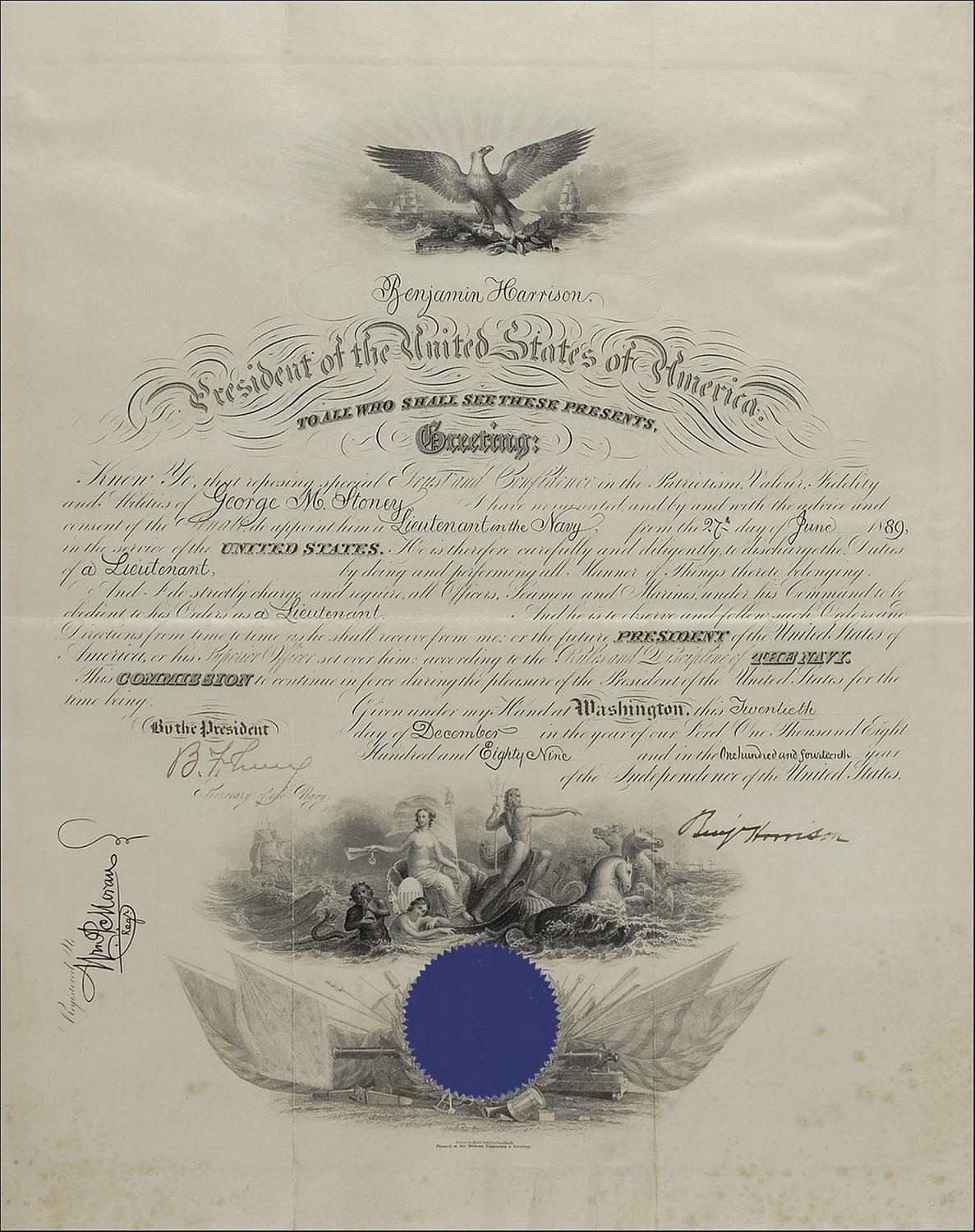 Partly-printed DS as president, signed “Benj. Harrison,” one page, 15.75 x 19.5, December 20, 1889. President Harrison appoints George M. Stoney a “Lieutenant in the Navy.” Signed at the conclusion by Harrison, and countersigned Secretary of the Navy Benjamin F. Tracy. Intersecting folds, a very subtle shade of toning from previous display, and some scattered light toning and foxing, otherwise fine, bright condition. The blue seal is slightly worn, but intact. Stoney was a graduate of the US Naval Academy in 1875 and first traveled to arctic Alaska in 1883 in connection with the attempt of the USS Rodgers to locate the missing Jeanette Expedition. Instead of becoming rescuers, the crew of the Rodgers themselves became stranded, surviving only with the assistance of the local Inuit community.