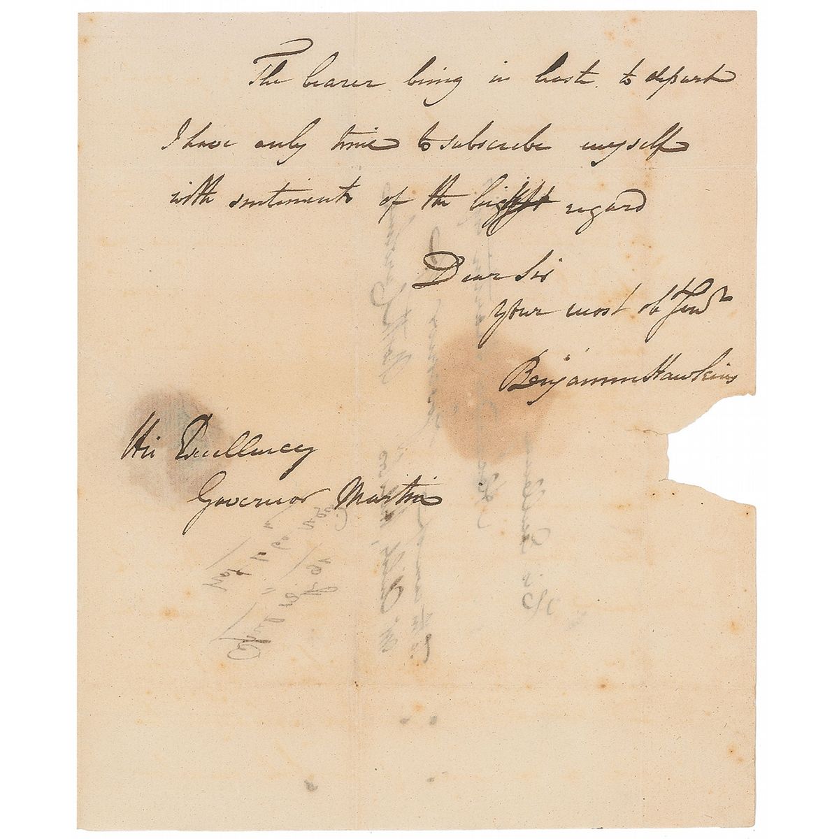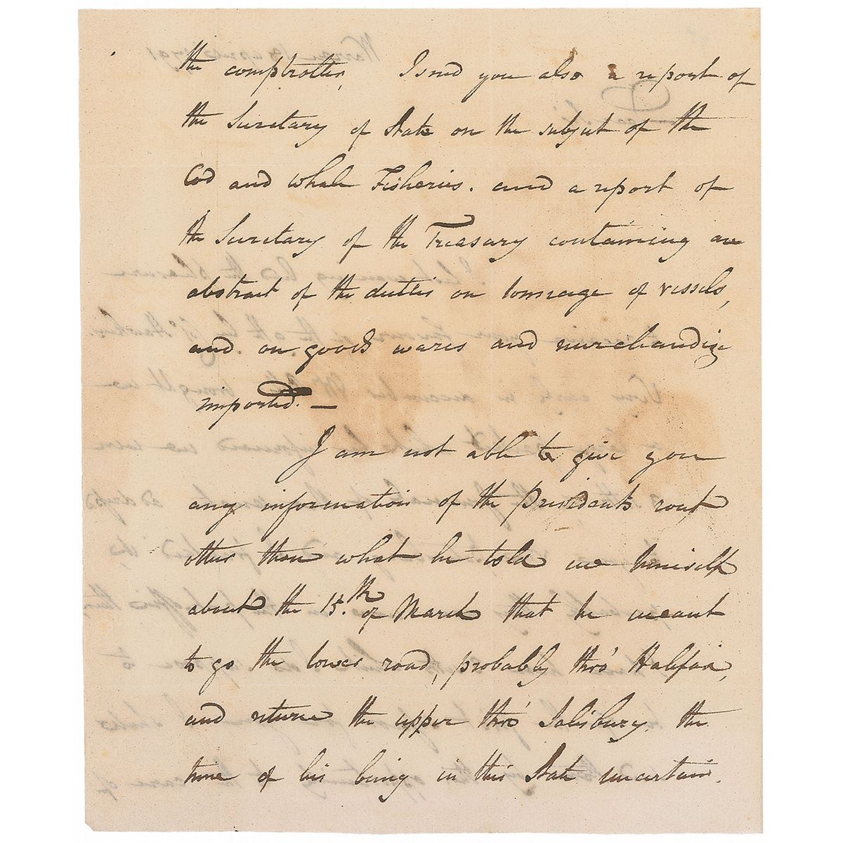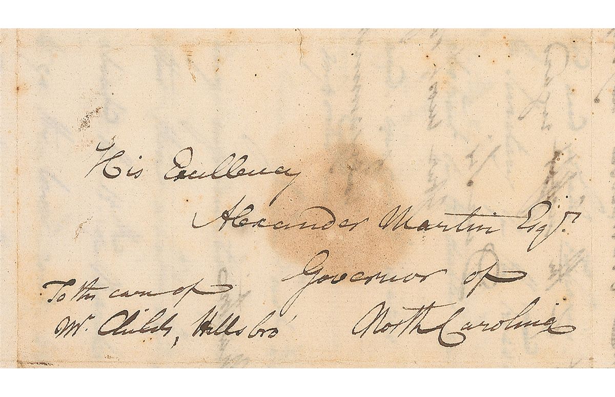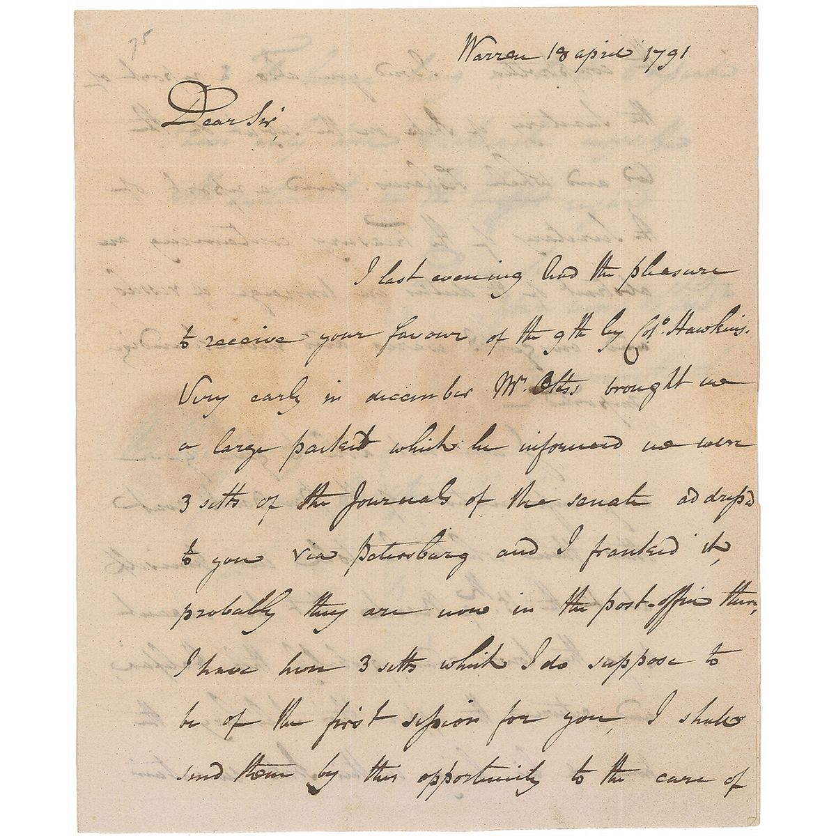 Statesman (1754–1816) who served as a senator from North Carolina and was the principal Indian agent to the Creek Indians. ALS, three pages on two adjoining sheets, 7.25 x 9, April 18, 1791. Letter to Governor Alexander Martin of North Carolina. In part: “Very early in December Mr. Otis brought me…3 setts of the Journals of the Senate addressed to you via Petersburg and I franked it, probably they are now in the post office…I send you also a report of the Secretary of State on the subject of the cod and whale fisheries…I am not able to give you any information of the President’s rout other than what he told me himself about the 15th of March that he meant to go to the lower road, probably thro’ Halifax, and return the upper thro’ Salisbury, the time of his being in the State uncertain.” Intersecting folds (one vertical fold passing through a single letter of the signature), circular areas of toning from the red wax seal, and some slight foxing, otherwise fine condition.
