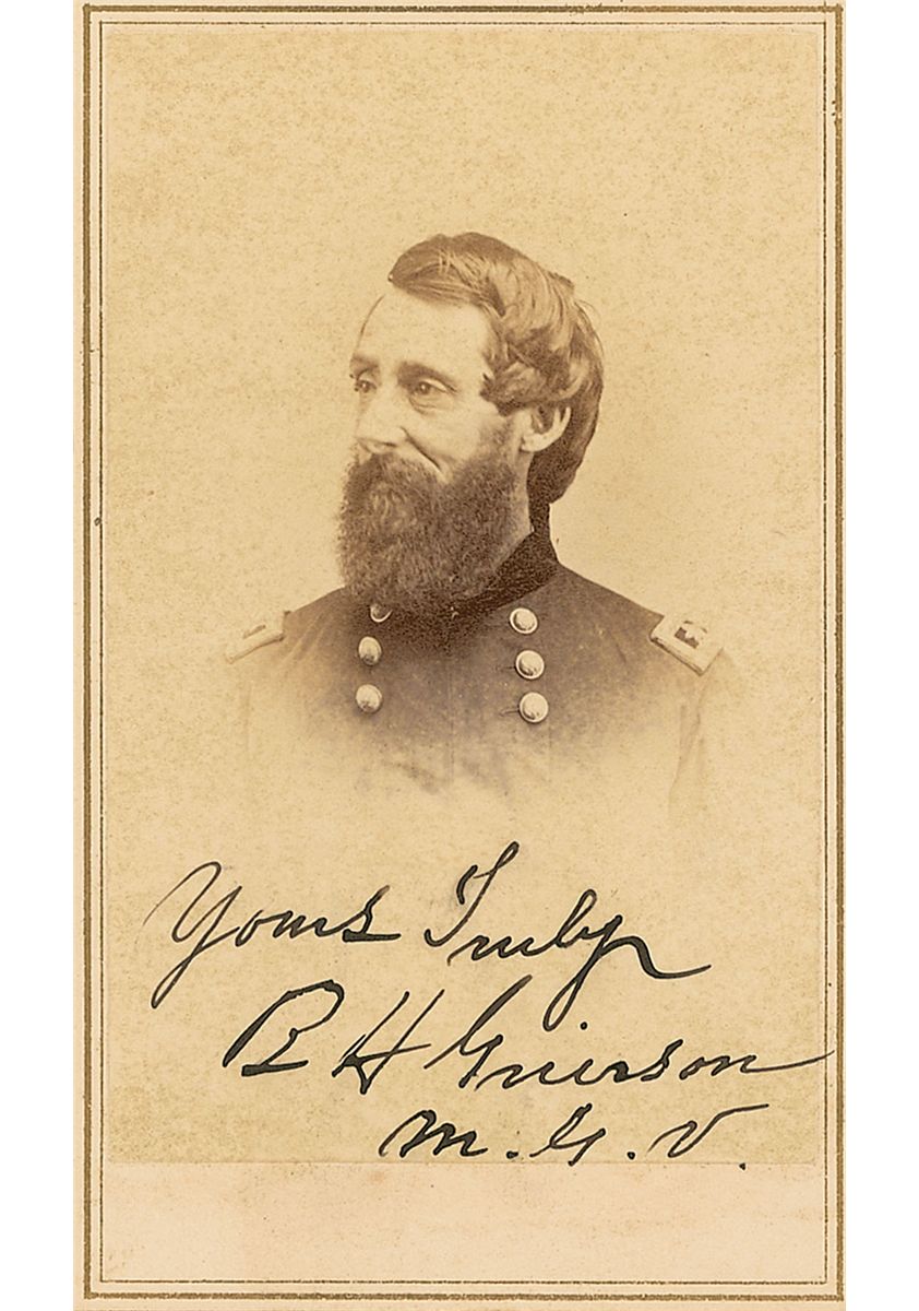 Union officer (1826–1911) who led an 1863 expedition through Confederate territory that severed lines of communication. Original 2.25 x 4 carte-de-visite photo by Gardner’s of Washington, D. C., signed below the image in black ink, “yours truly, B. H. Grierson, M.G.V.” In fine condition, with a revenue stamp affixed to reverse.