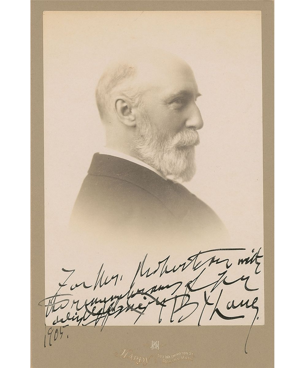 American conductor and pianist (1837–1909) who conducted the world premiere of Tchaikovsky’s Piano Concerto No. 1 in Boston. Original 4.25 x 6.5 cabinet profile photo, by Hardy Studios of Boston, hastily inscribed at the bottom of the image in black ink and signed “B. J. Lang, 1905.” In fine condition, with mounting remnants to reverse.