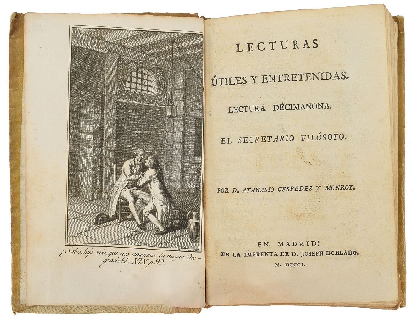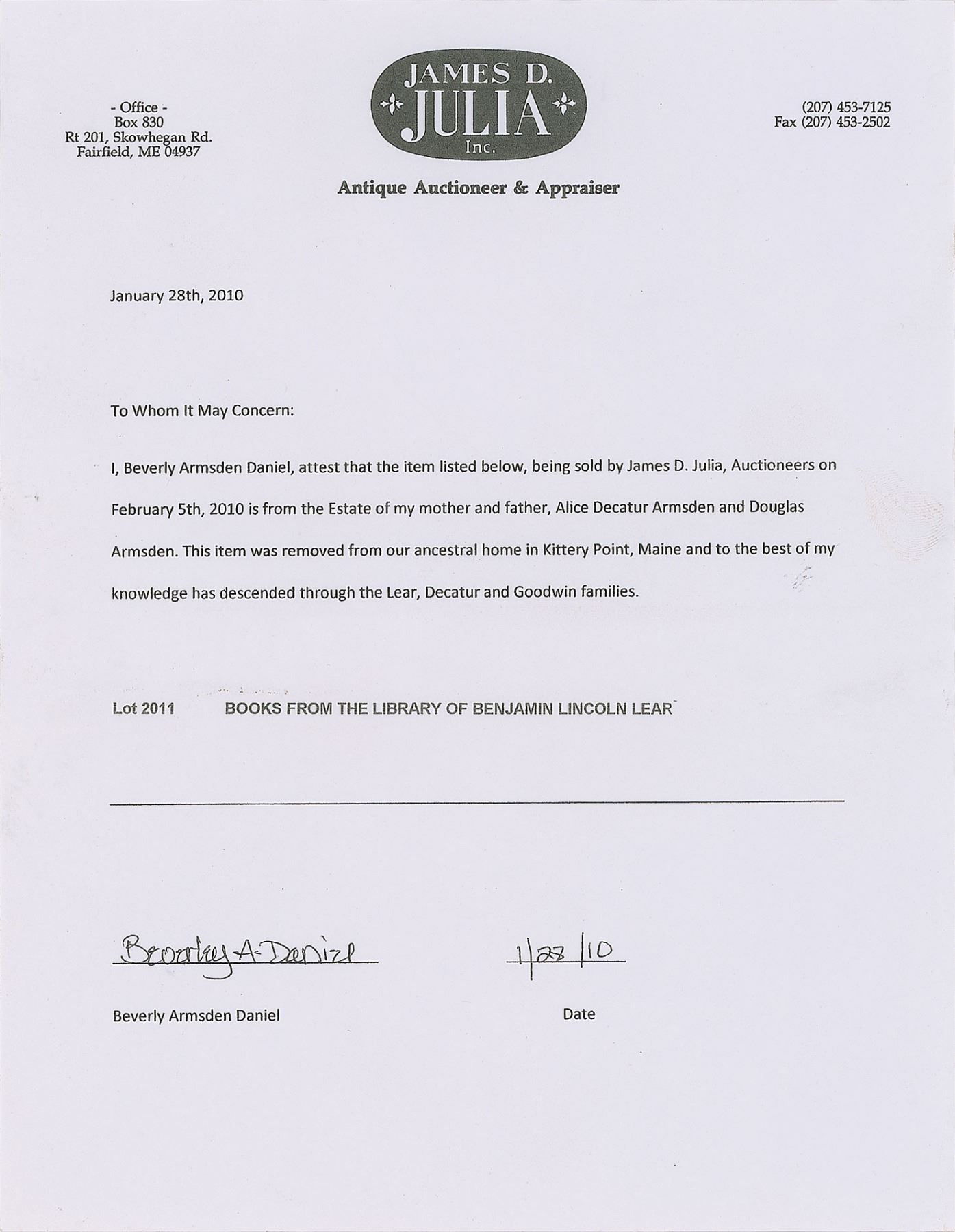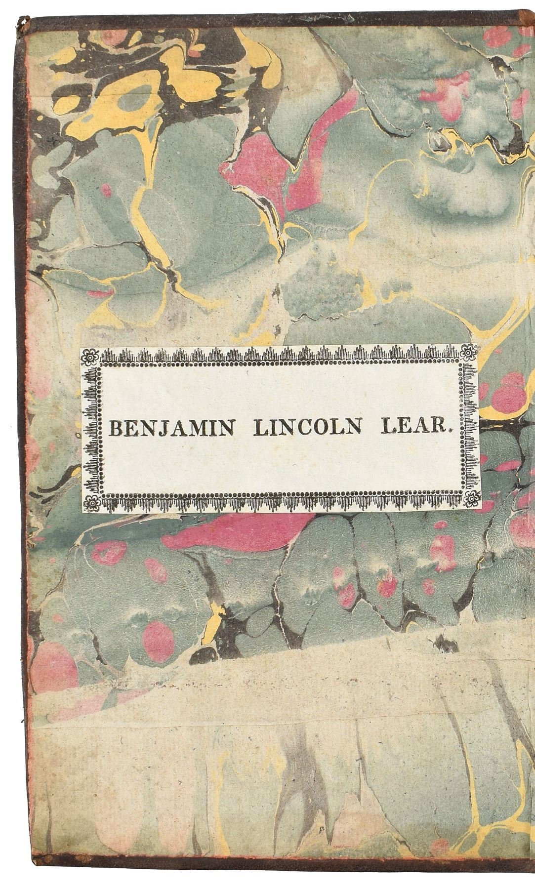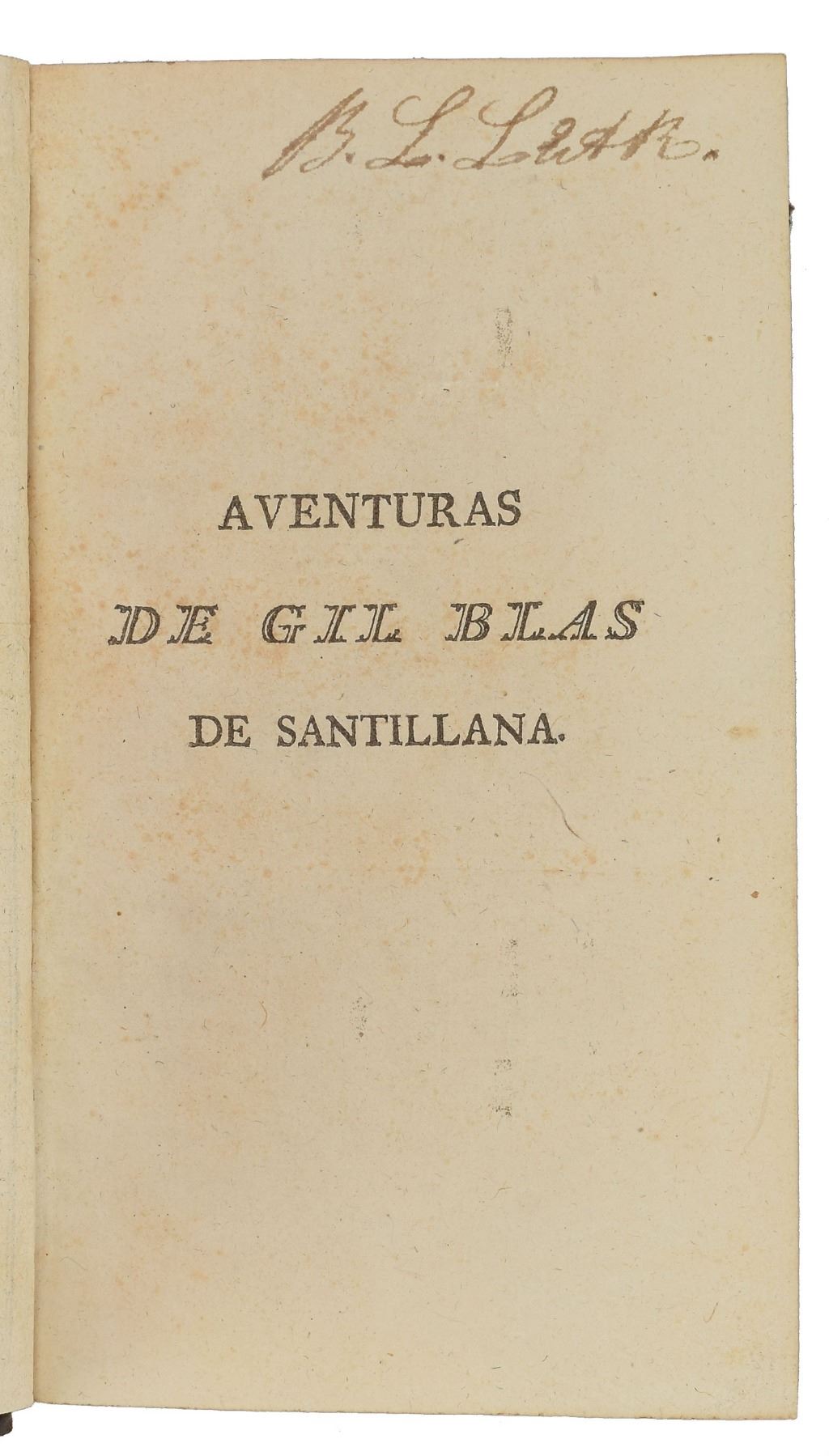 Collection of 11 books from the library of Benjamin Lincoln Lear, the son of George Washington's personal secretary Tobias Lear, all bearing simple "Benjamin Lincoln Lear" bookplates affixed inside, with five signed by him. Includes five leatherbound volumes of Aventuras de Gil Blas de Santillana, published in Madrid in 1805, all signed on the title page with his ownership signature, "B L. Lear"; a leatherbound volume entitled Diccionario Portatil y de Pronunciacion, Frances-Espanol, published in Leon in 1803; and five small vellum-bound volumes of Spanish lectures. In overall good to very good condition, with general wear and soiling. Provenance: James D. Julia Auctioneers, 2010.