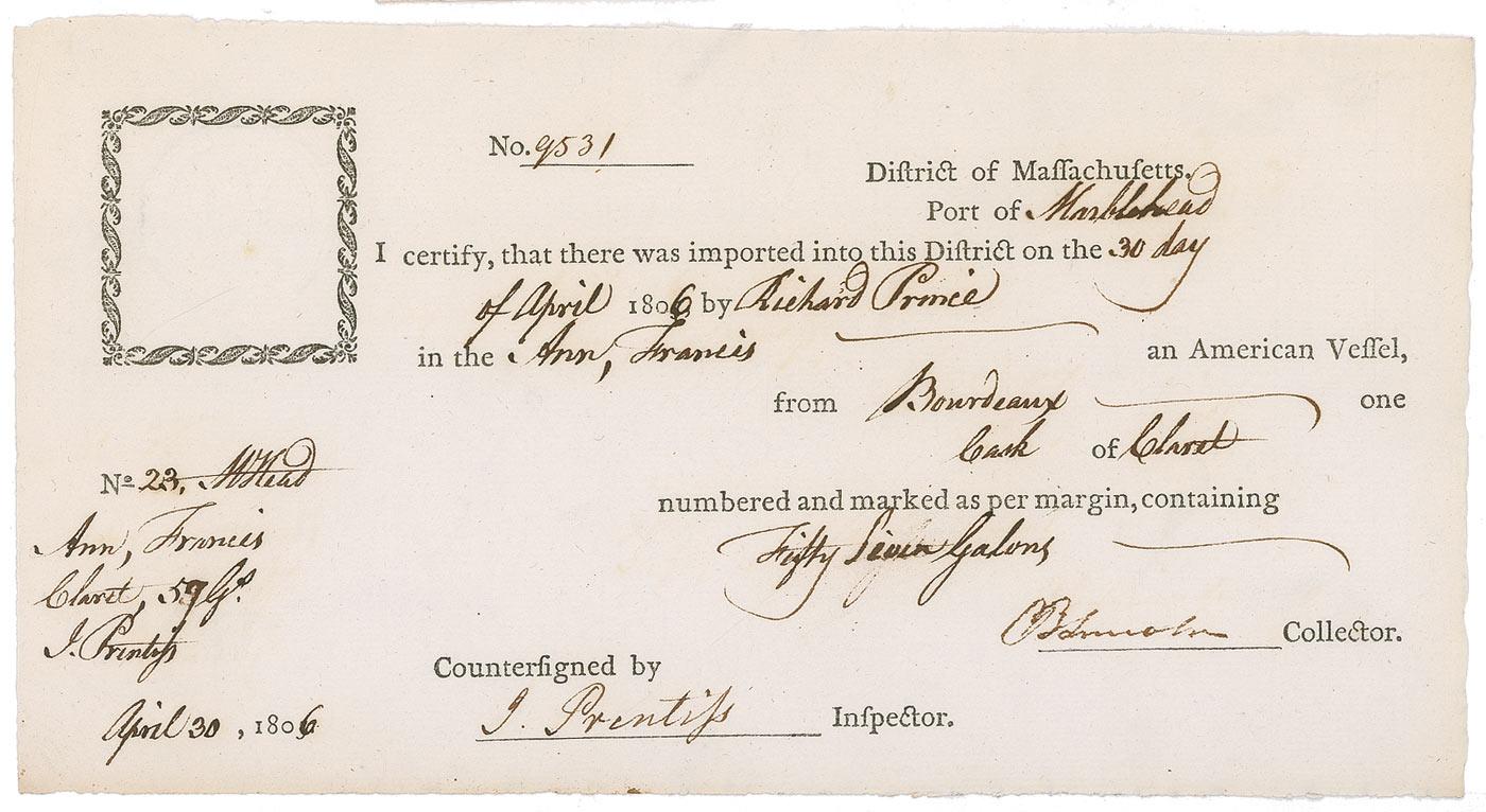 Major general in the Continental Army (1733–1810) during the American Revolutionary War known for being the officer who formally accepted the British surrender at Yorktown. Partly-printed DS, signed “B. Lincoln,” one page, 9.5 x 5, April 30, 1806. As Collector of the port of Marblehead, Lincoln signs to attest the American vessel Ann Francis imported one cask of Claret from Bordeaux. In fine, clean condition, with some scattered light toning.