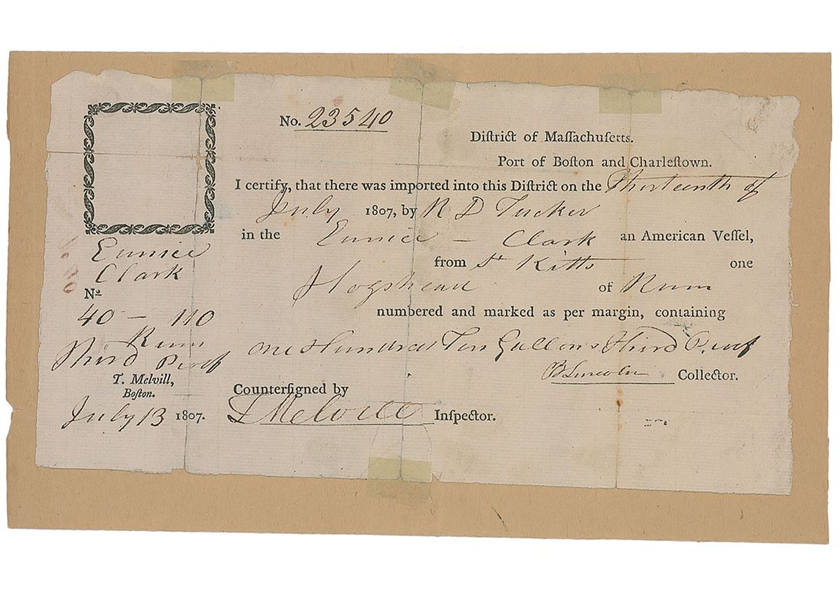 Major general in the Continental Army (1733-1810) during the American Revolutionary War, known as the officer who formally accepted the British surrender at Yorktown. Partly-printed DS, signed “B. Lincoln,” one page, 9.75 x 5.25, July 13, 1807. Lincoln signs off on an import “from St. Kitts one Hogshead of Rum.” Partiall affixed to a slightly larger sheet. Partial separations to several intersecting folds (one vertical fold passing though a single letter of the signature), crude tape repairs to edges, and scattered soiling, otherwise very good condition.