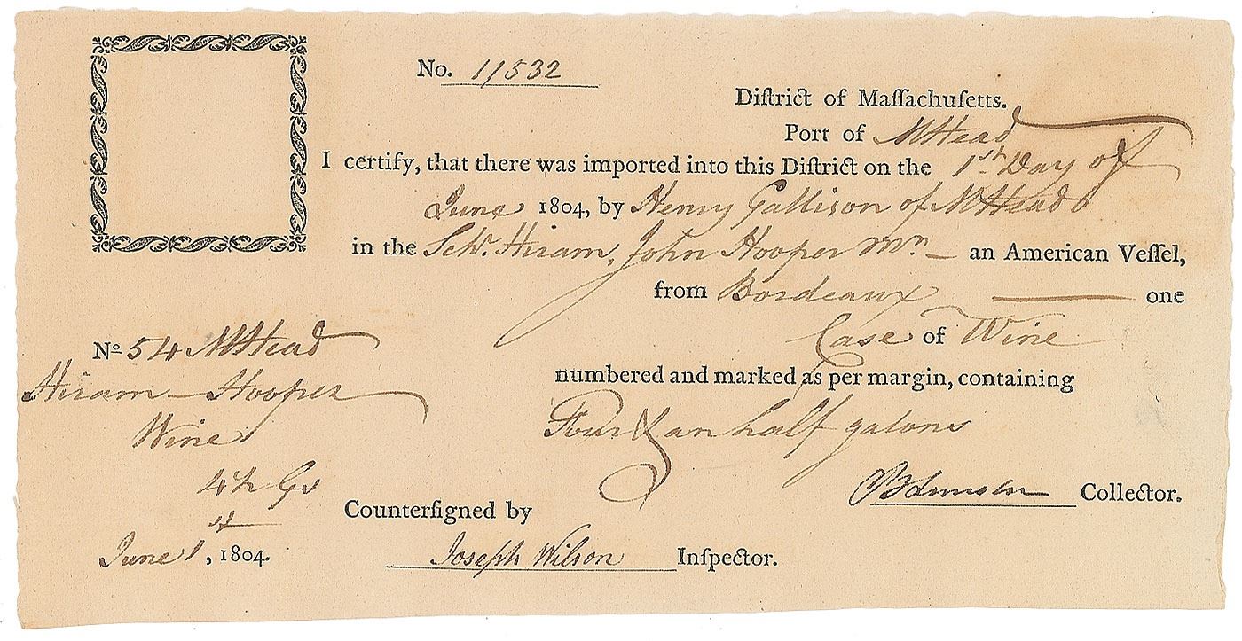 Major general in the Continental Army (1733-1810) during the American Revolutionary War, known as the officer who formally accepted the British surrender at Yorktown. Partly-printed DS, signed “B. Lincoln,” one page, 9.5 x 4.75, June 1, 1804. Port of Marblehead document certifying an import of “one Case of Wine numbered and marked as per margin, containing Four & an half galons." Signed at the conclusion by Lincoln as collector. In fine condition.