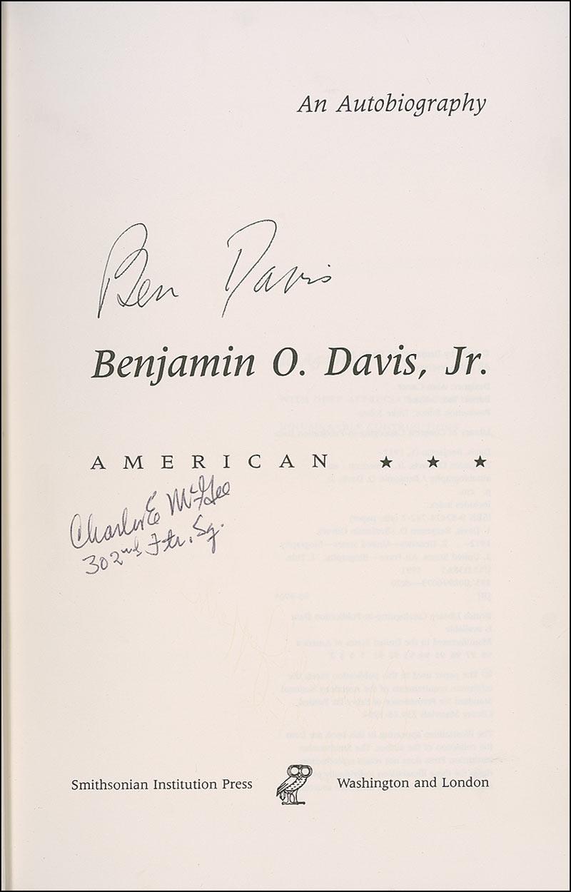 Signed book: Benjamin O. Davis, Jr., A Biography. First edition, later printing. Washington, D. C.: Smithsonian Institution Press, 1991. Hardcover with dustjacket, 6.25 x 9.25, 442 pages. Signed on the title page and opposite page by Benjamin Davis, Charles McGee, Alexander Jefferson, and Robert Martin. In fine condition.
