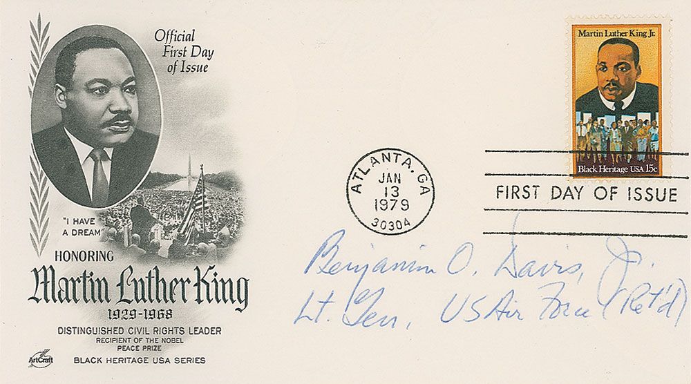 Commander of the World War II Tuskegee Airmen (1912–2002). FDC with a cachet honoring Martin Luther King, signed on the front in blue ballpoint, “Benjamin O. Davis, Jr., Lt. Gen. US Air Force (Ret’d).” In fine condition.