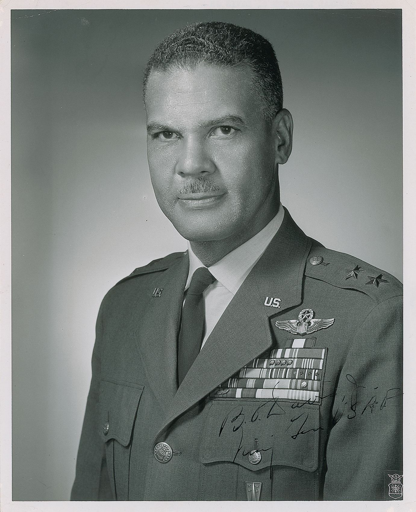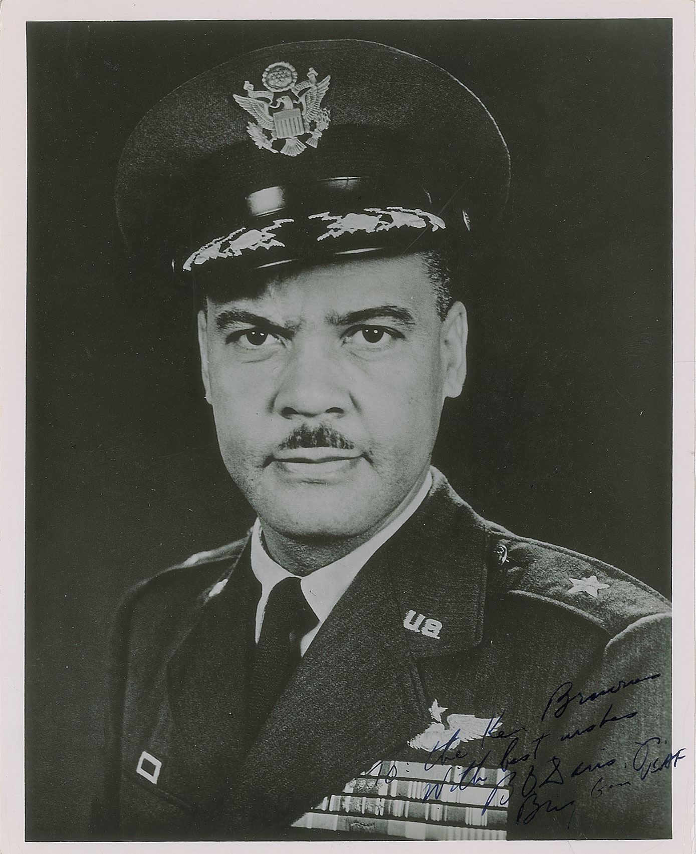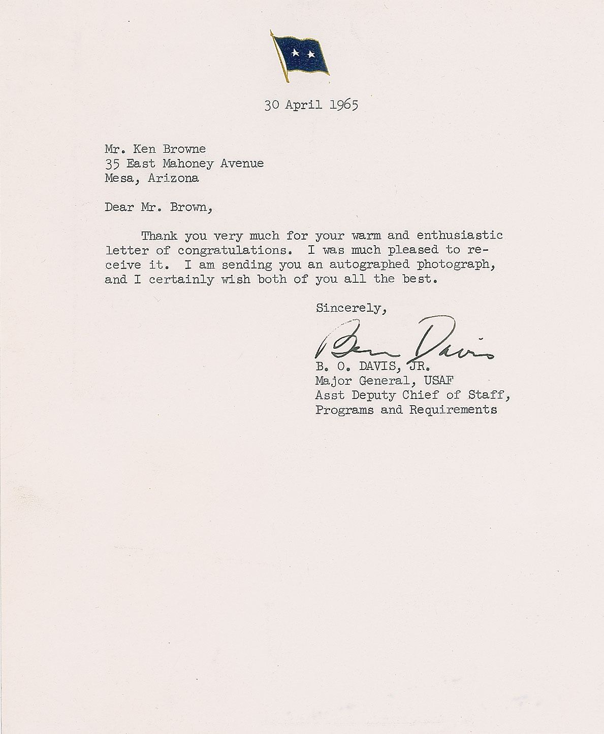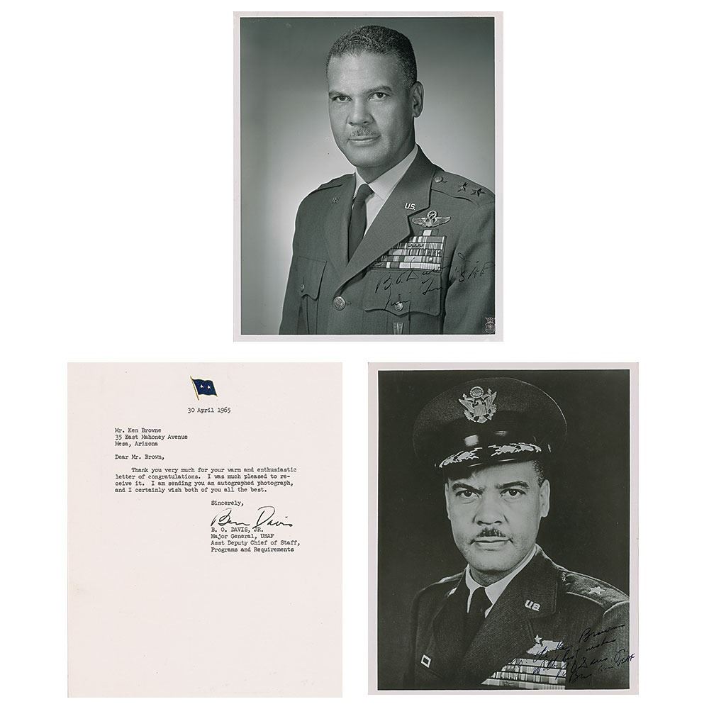 Commander of the World War II Tuskegee Airmen (1912–2002). Three items: a vintage glossy 8 x 10 photo of Davis in uniform, signed and inscribed in fountain pen, "To: the Ken Brownes, With best wishes, B. O. Davis, Jr., Brig. Gen. USAF"; a different vintage glossy 8 x 10 photo of Davis in uniform, signed in fountain pen, "B. O. Davis, Jr., Maj. Gen. USAF"; and a TLS signed "Ben Davis," one page, 7 x 8.5, two-star general's letterhead, April 30, 1965, in part: "I am sending you an autographed photograph, and I certainly wish both of you all the best." In fine condition.